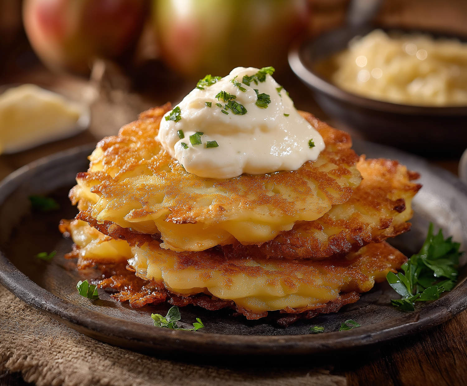 Golden potato pancakes topped with sour cream and chives, served with applesauce. Crispy, delicious, and beautifully presented.