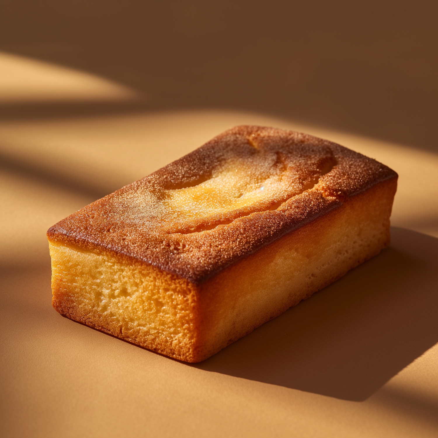 Golden-brown rectangular cake loaf on a light brown surface, showcasing a perfect bake with a soft, moist texture.