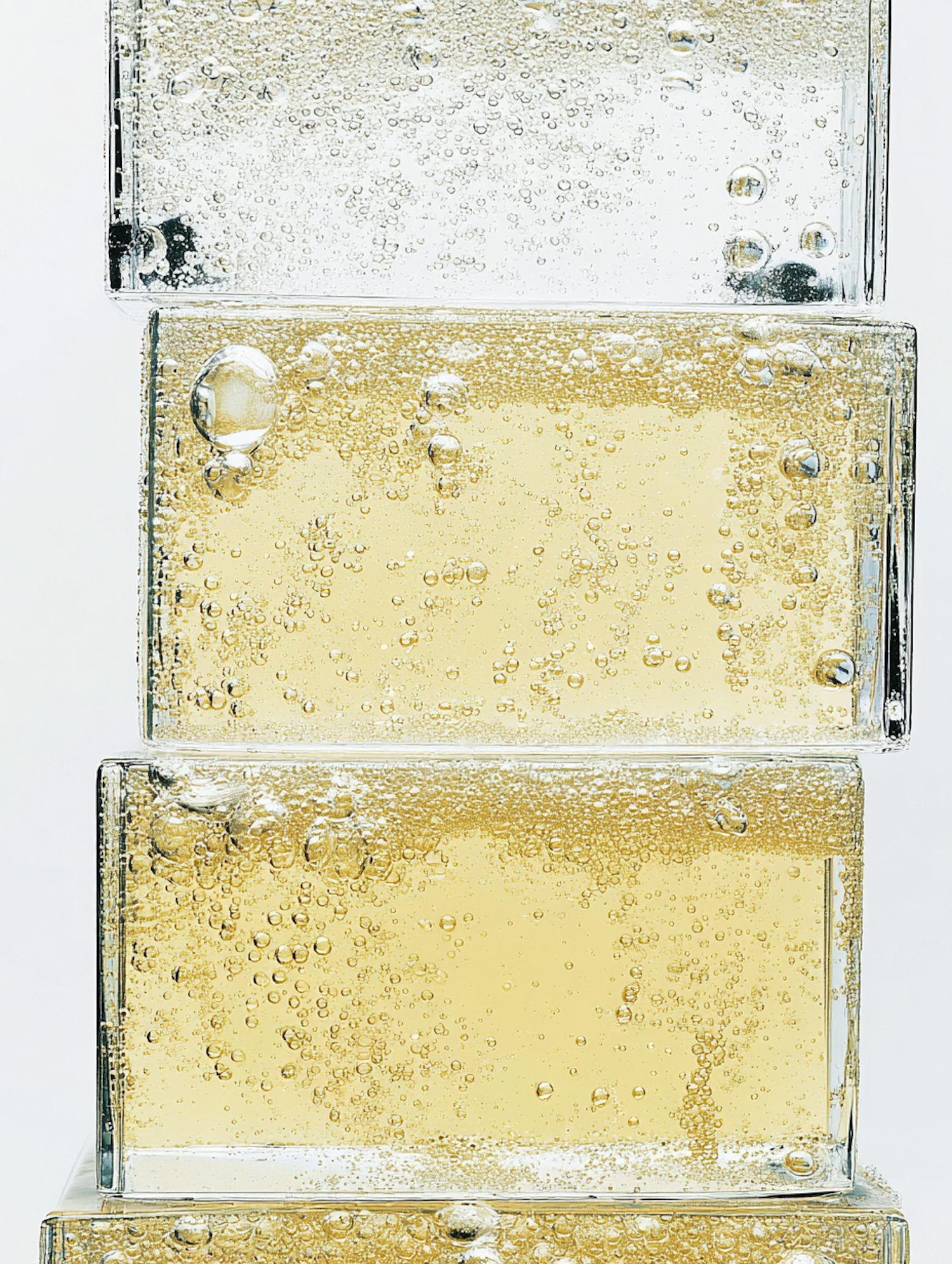 Close-up of stacked transparent blocks filled with golden liquid and bubbles, creating a minimalistic and visually striking composition.