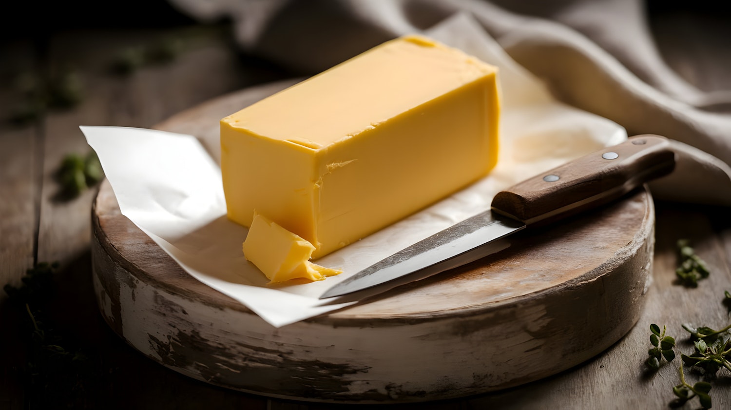 Golden butter block on parchment with a wooden-handled knife, rustic board, and fresh herbs in warm, cozy lighting.