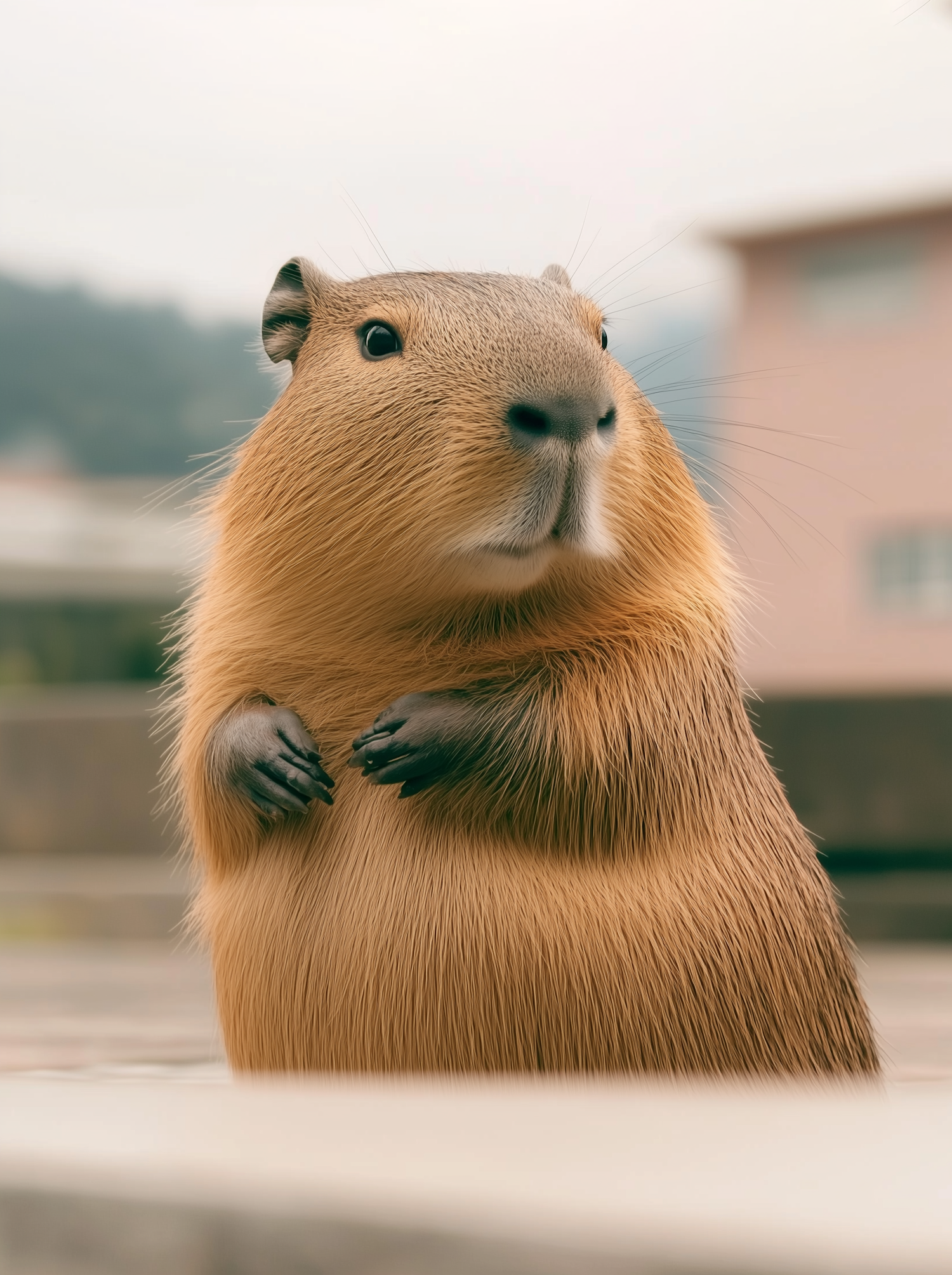 Adorable close-up of a capybara standing upright with golden-brown fur and curious black eyes, set against a softly blurred outdoor background.
