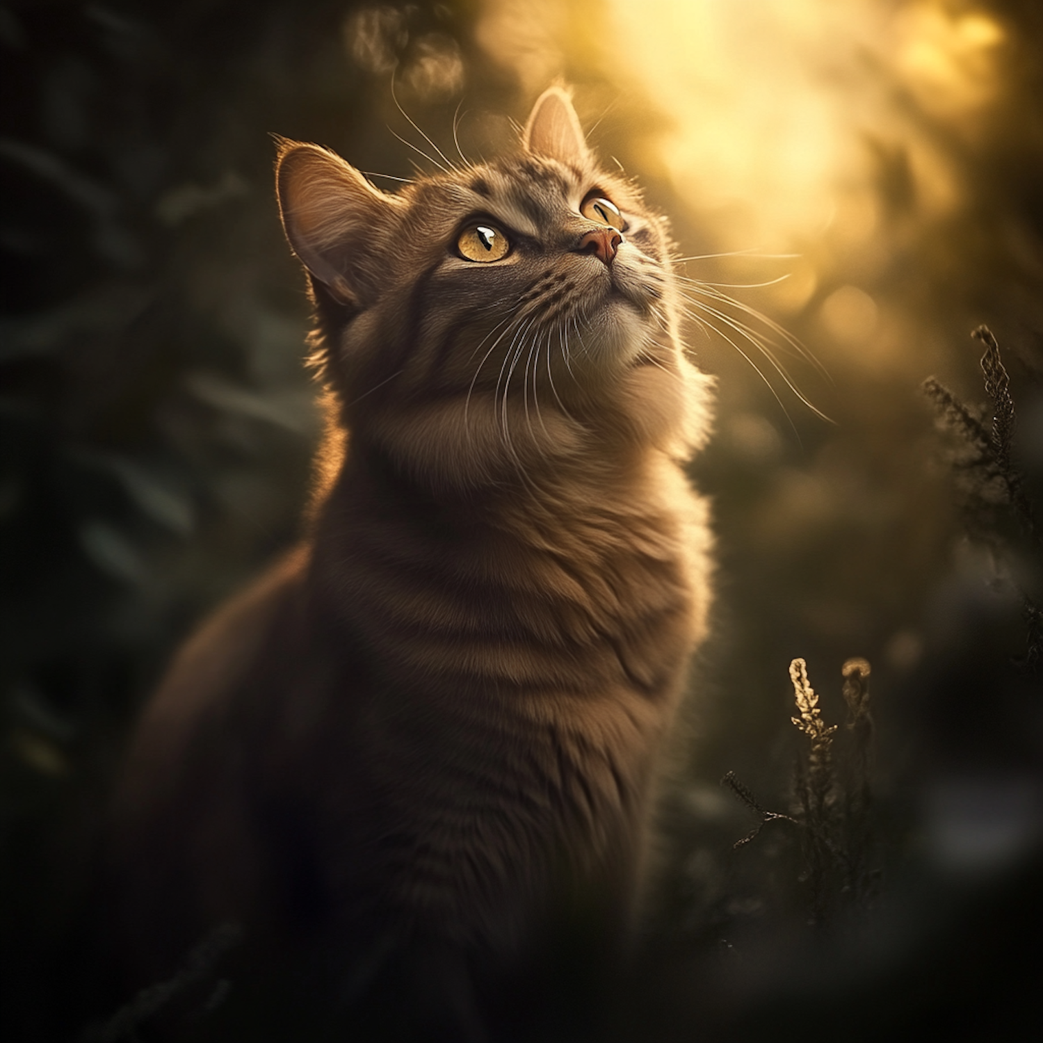 A golden-brown cat gazes upwards, bathed in warm sunlight, creating a serene and magical atmosphere.
