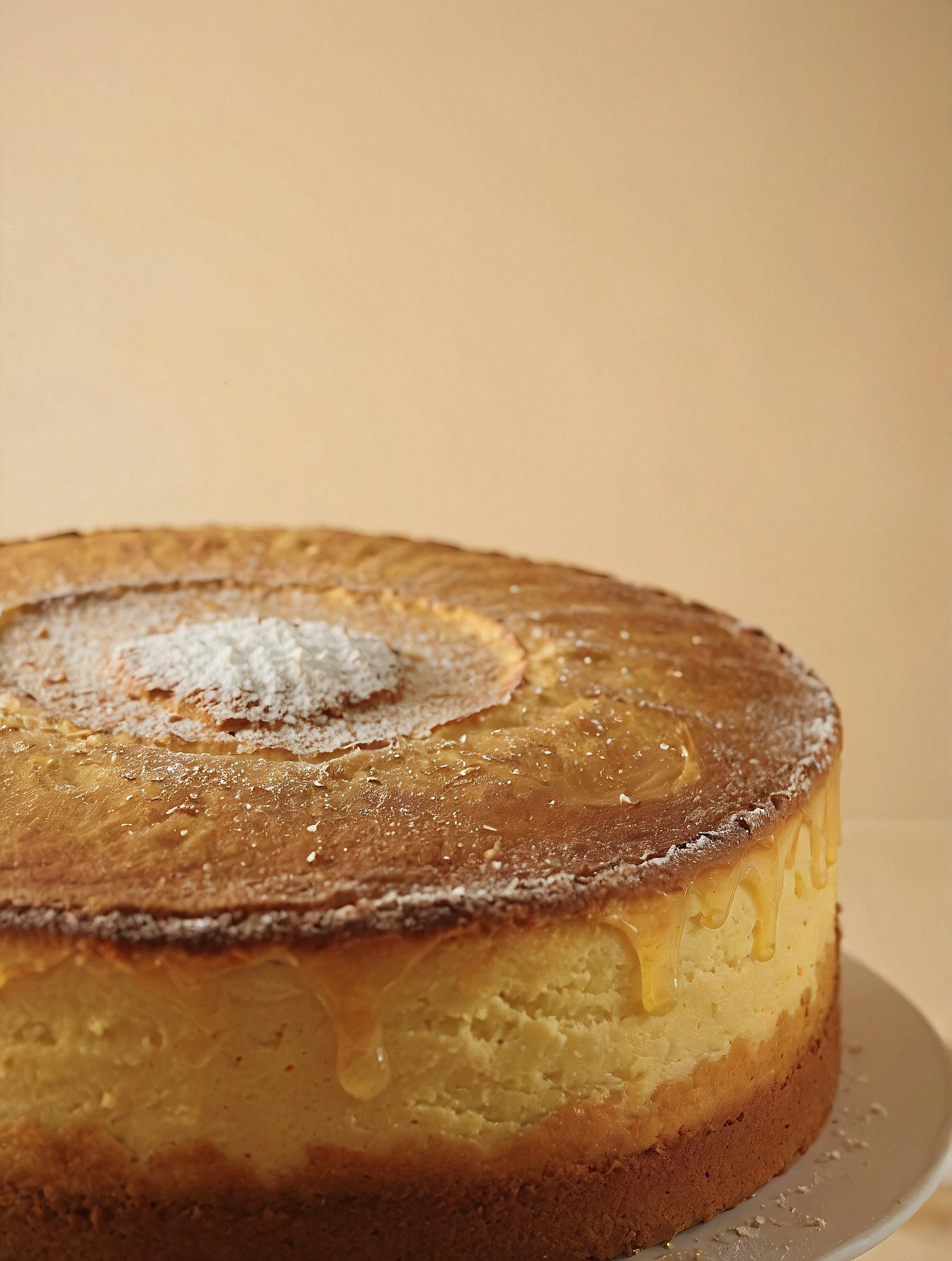 Golden cheesecake with powdered sugar and honey drips, set against a warm beige background. Perfect for dessert lovers!