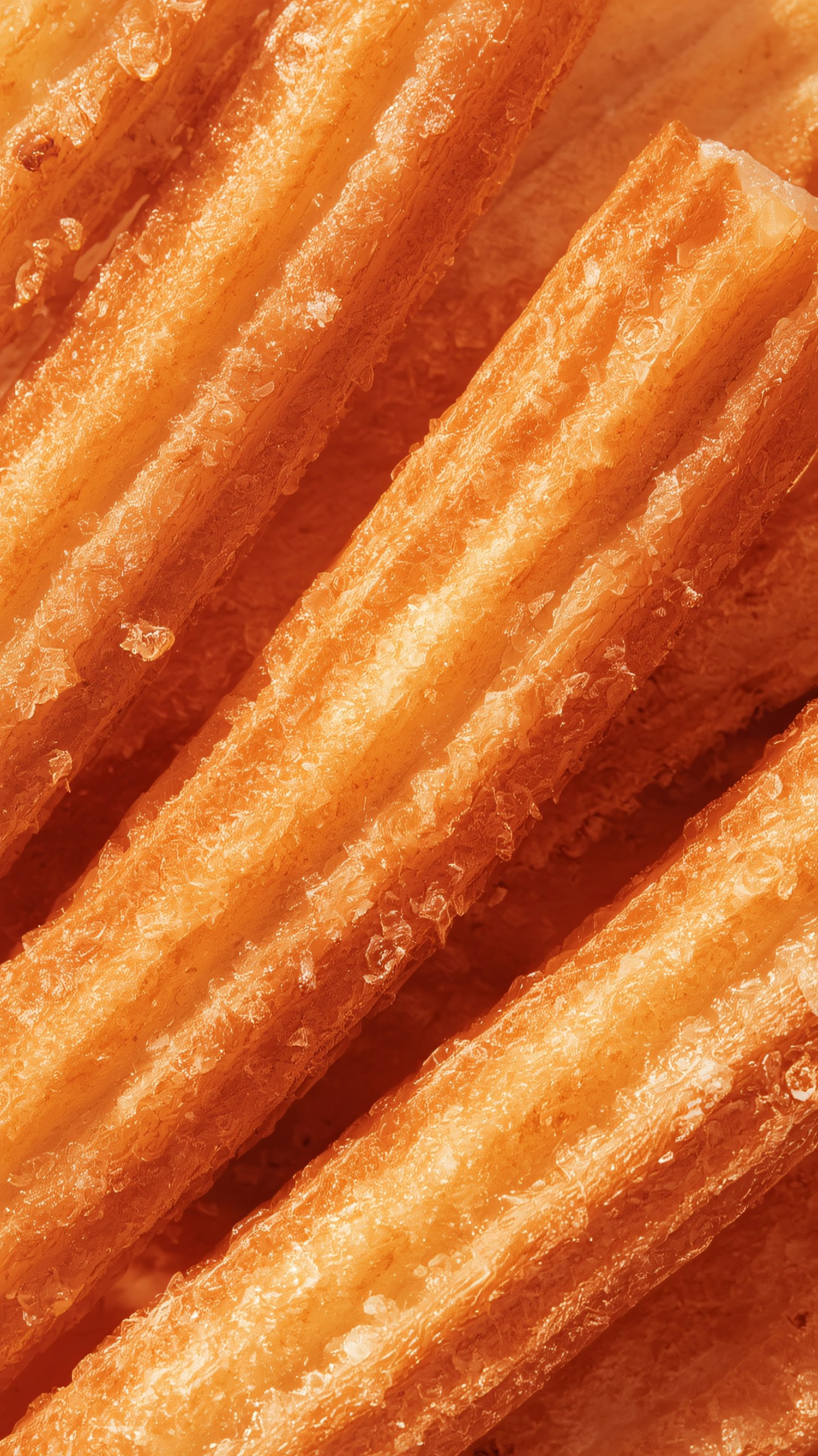 Close-up of golden-brown churros with a sugar-coated, crispy texture, showcasing their ridged design and delicious appearance.