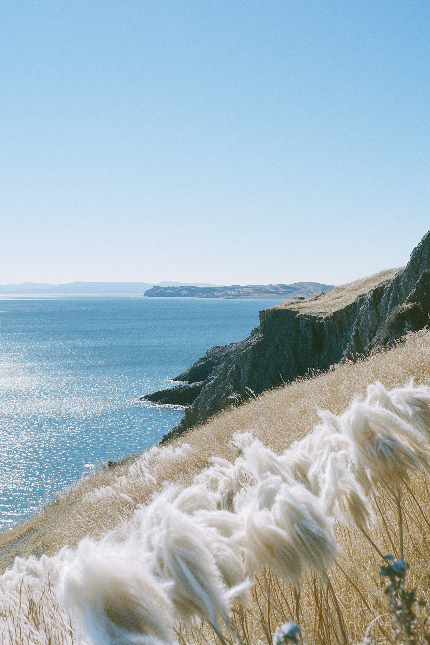 Golden pampas grass on a sunlit hillside overlooking a calm ocean with rugged cliffs and a clear blue sky in the background.