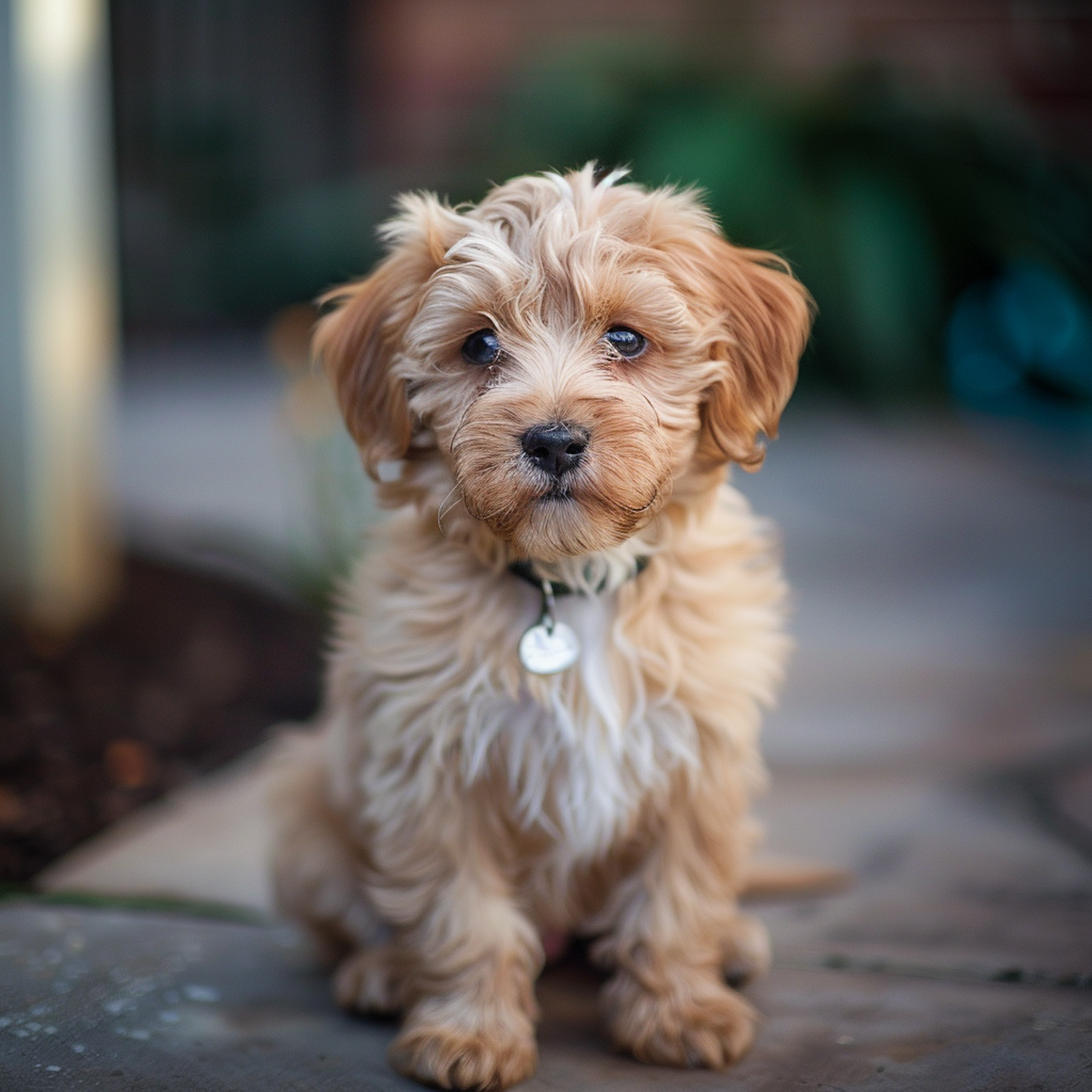Adorable fluffy puppy with curly light brown fur and a black collar sits on a stone path, surrounded by a softly blurred green background.