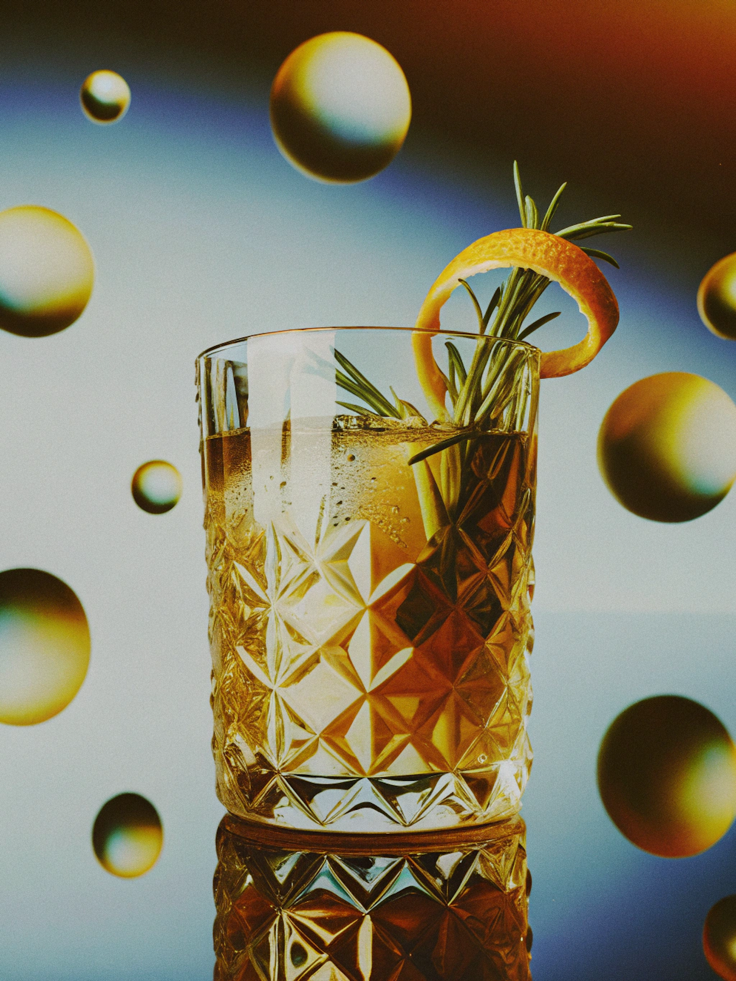 Elegant cocktail in a textured glass with rosemary and orange garnish, set against a surreal background of floating golden spheres.