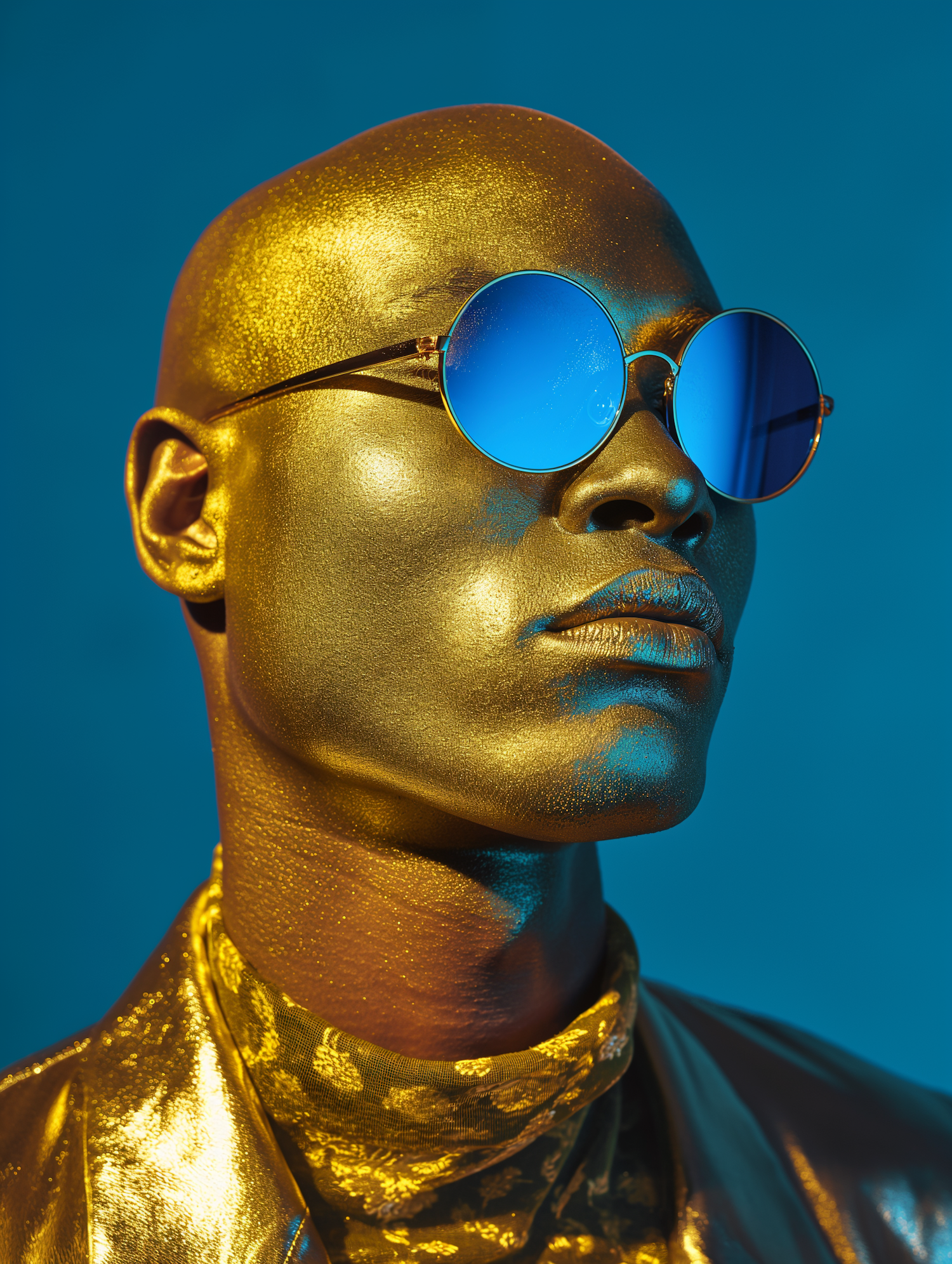 A person painted in metallic gold with blue sunglasses against a teal background, exuding a futuristic and luxurious vibe.