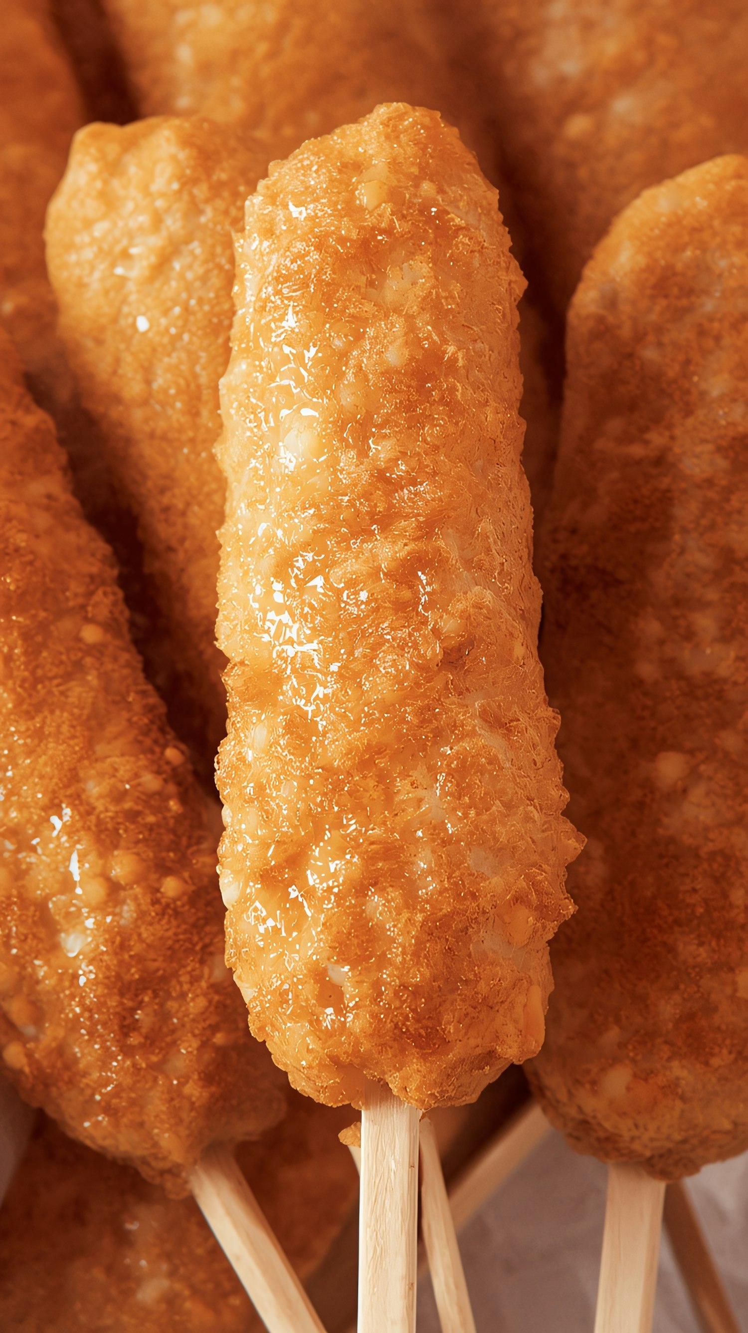 Close-up of crispy, golden-brown corn dogs on sticks, showcasing their textured batter and inviting appearance.