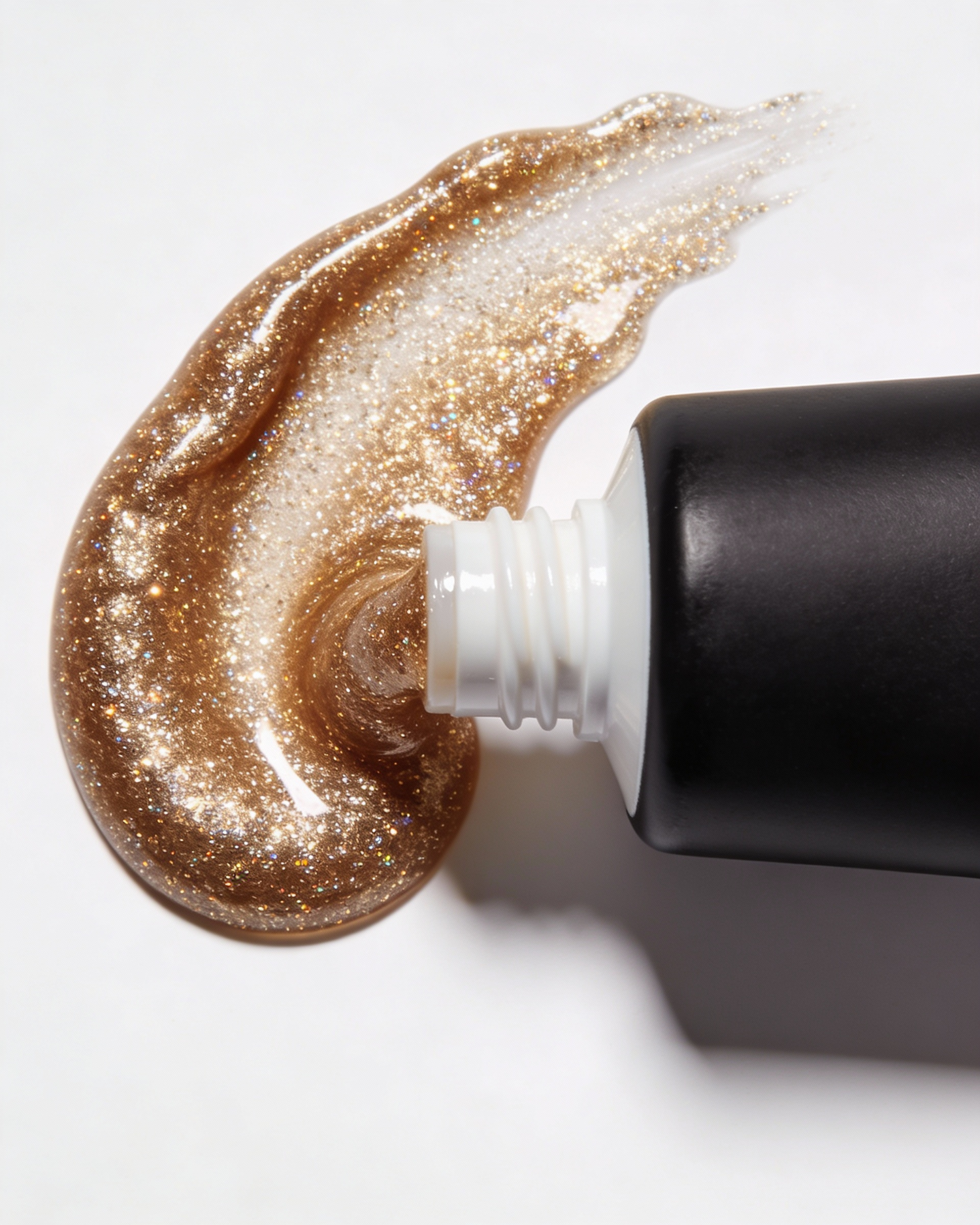 Ultra realistic macro product photography of a cosmetic squeeze tube dispensing metallic glitter gel. Clean pure white seamless studio background. Extreme close-up, centered composition. The top part of a matte black cosmetic tube is visible from the lower frame, cropped so only the upper half is seen. The tube has a smooth minimal design, soft-touch matte finish, cylindrical shape, subtle curvature, no branding. A white plastic screw neck is visible with a glossy white applicator nozzle. Thick gel product is overflowing from the nozzle and folded over itself, forming a soft rounded droplet shape that hangs and curves to the left. The product is a rich metallic gold gel with dense fine glitter particles, highly reflective with sparkling shimmer and realistic viscosity. The gold gel shows smooth wet highlights, small glitter sparkles, and slightly transparent edges where light passes through. Soft diffused studio lighting, crisp focus on the gel texture and shimmer, subtle shadow under the product, high-end beauty campaign macro shot, hyper realistic, 8K