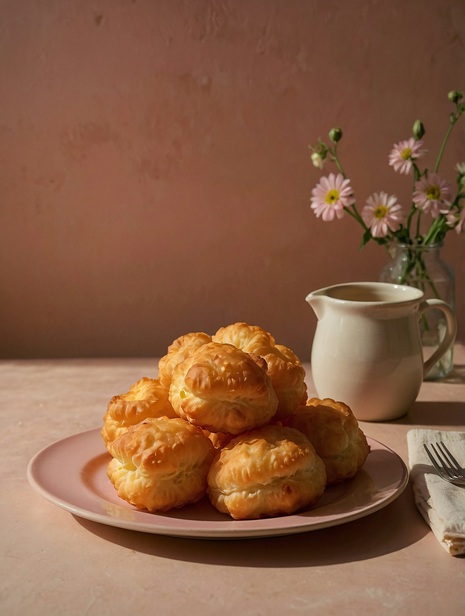 Golden cream puffs on a pink plate with a white pitcher and pink daisies in the background, creating a cozy tea-time vibe.