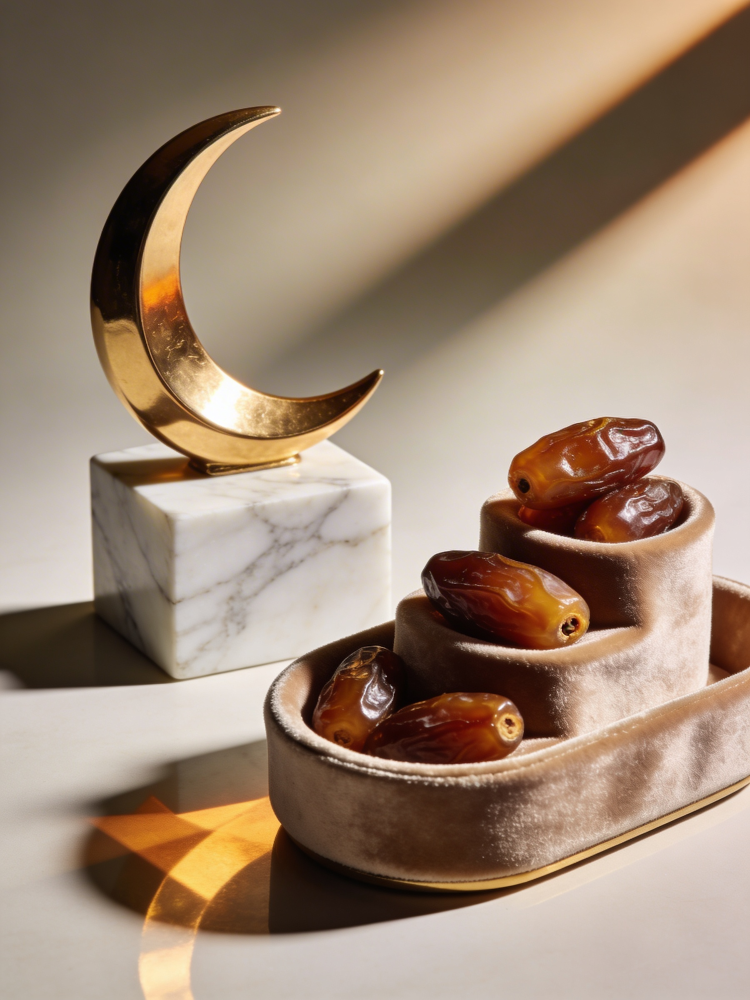 A high‑definition luxury Ramadan still life. A brushed‑gold crescent sculpture sits on a marble plinth beside a velvet‑lined dish filled with glossy dates. Soft, warm spotlighting creates long elegant shadows across a neutral background, giving the scene a refined, high‑end editorial mood. No text, no logos.