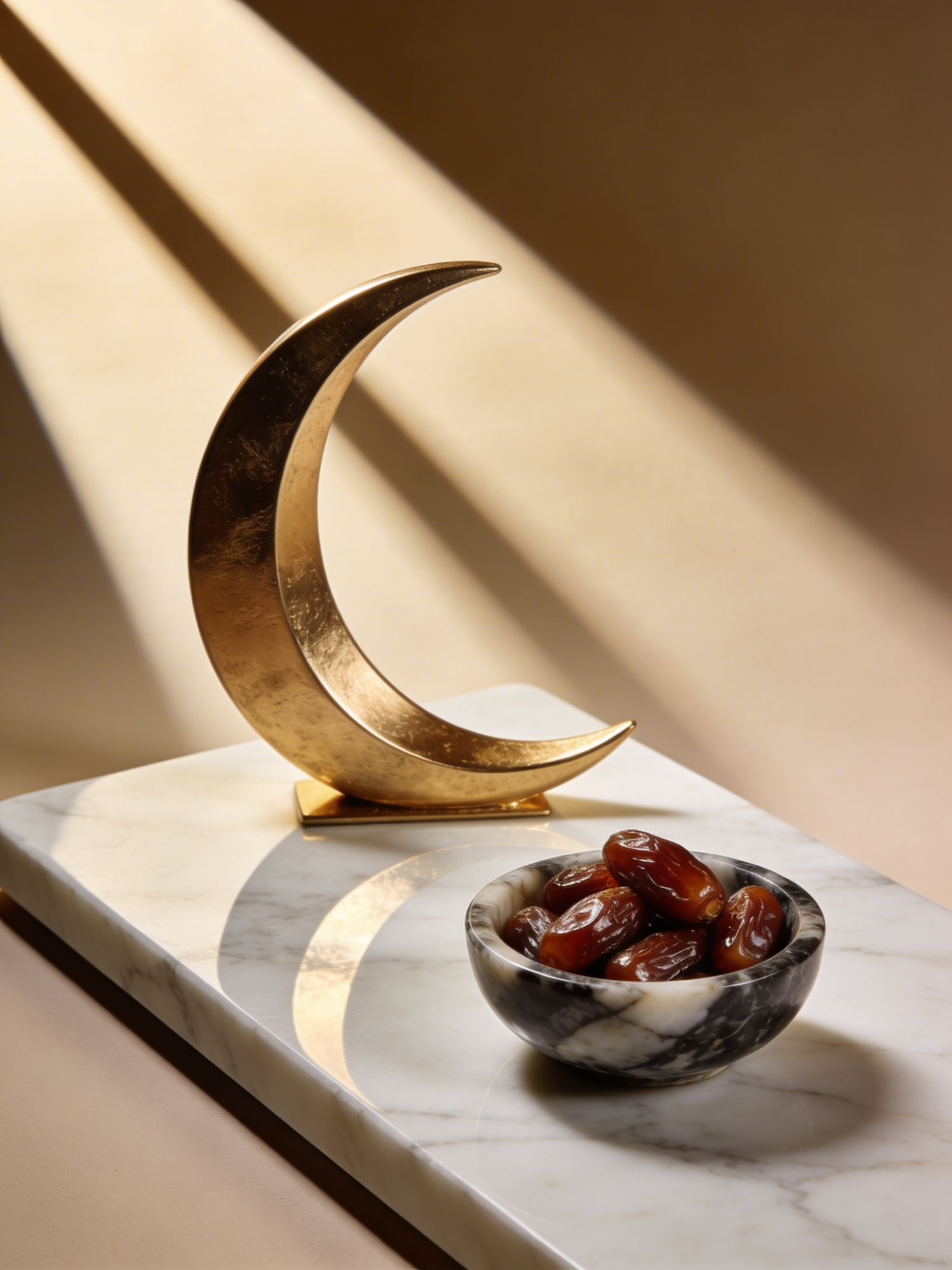 A high‑definition ultra‑luxury Ramadan still life. A polished white‑marble slab holds a brushed‑gold crescent sculpture beside a small onyx bowl filled with glossy dates. Soft spotlighting creates long elegant shadows across a warm neutral background. Rich textures, clean composition, no text, no logos.