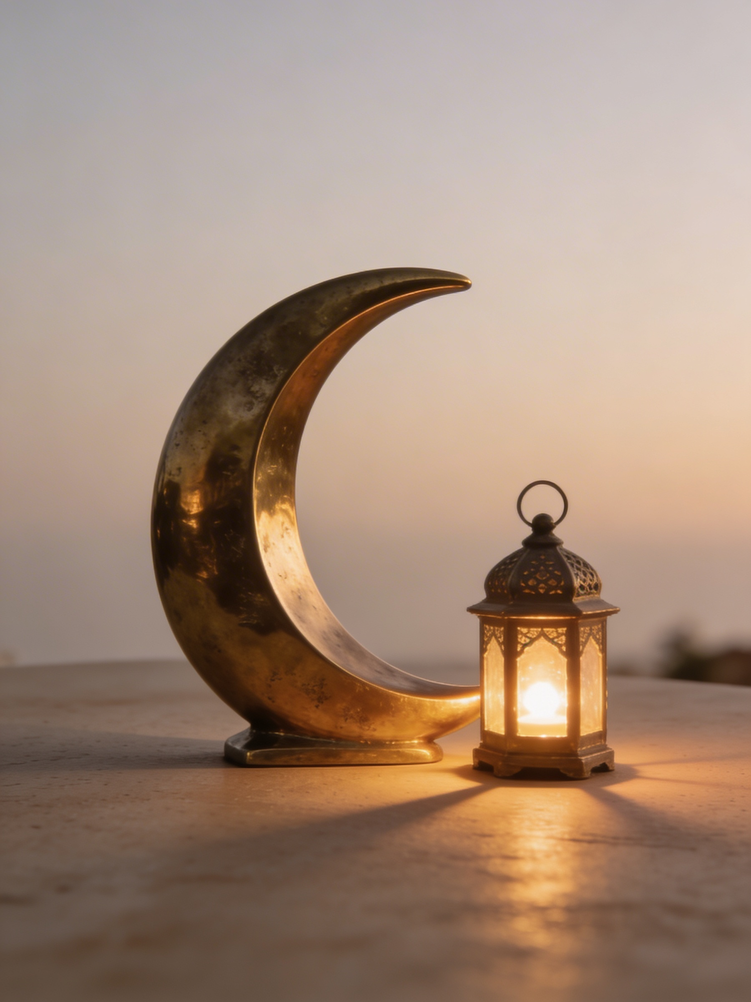 A high‑definition Ramadan editorial still life. A brass crescent moon sculpture sits beside a small glowing lantern on a neutral surface. Soft warm light creates a peaceful evening mood. Minimal shadows, clean background, no text, no logos.
