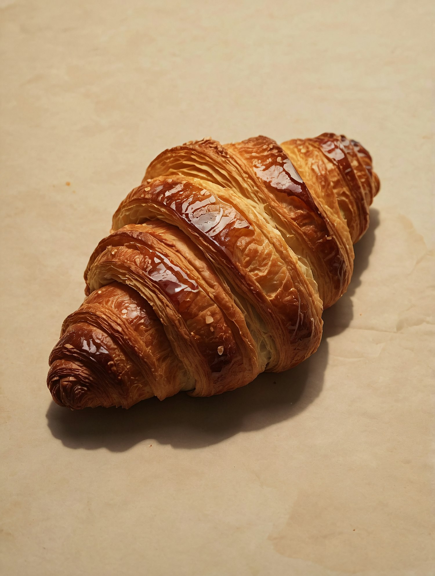 Golden, flaky croissant with a glossy finish on parchment paper, showcasing its buttery layers and crisp texture.