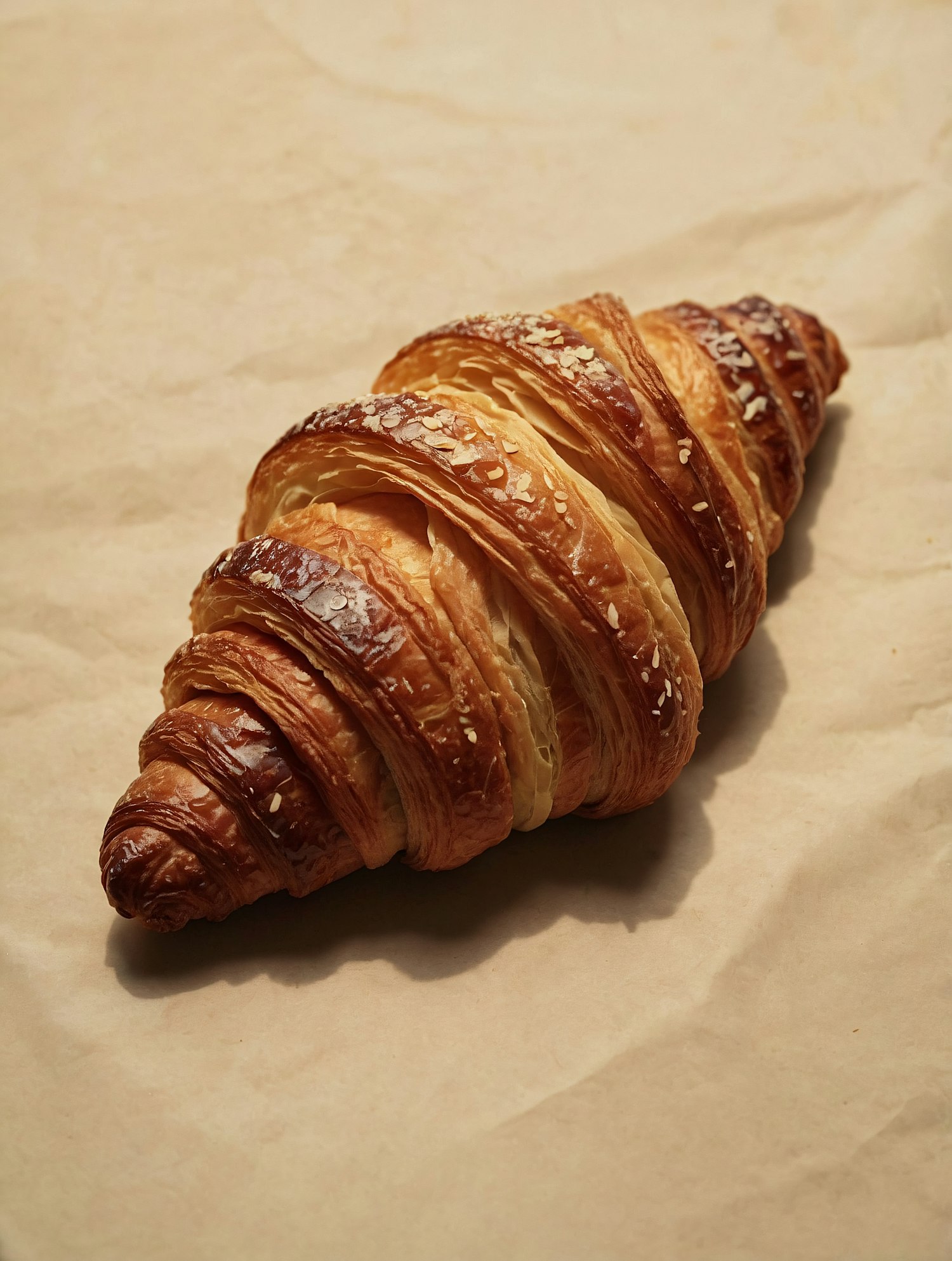 Golden, flaky croissant with sesame seeds on parchment paper, showcasing its delicate layers and artisanal quality.