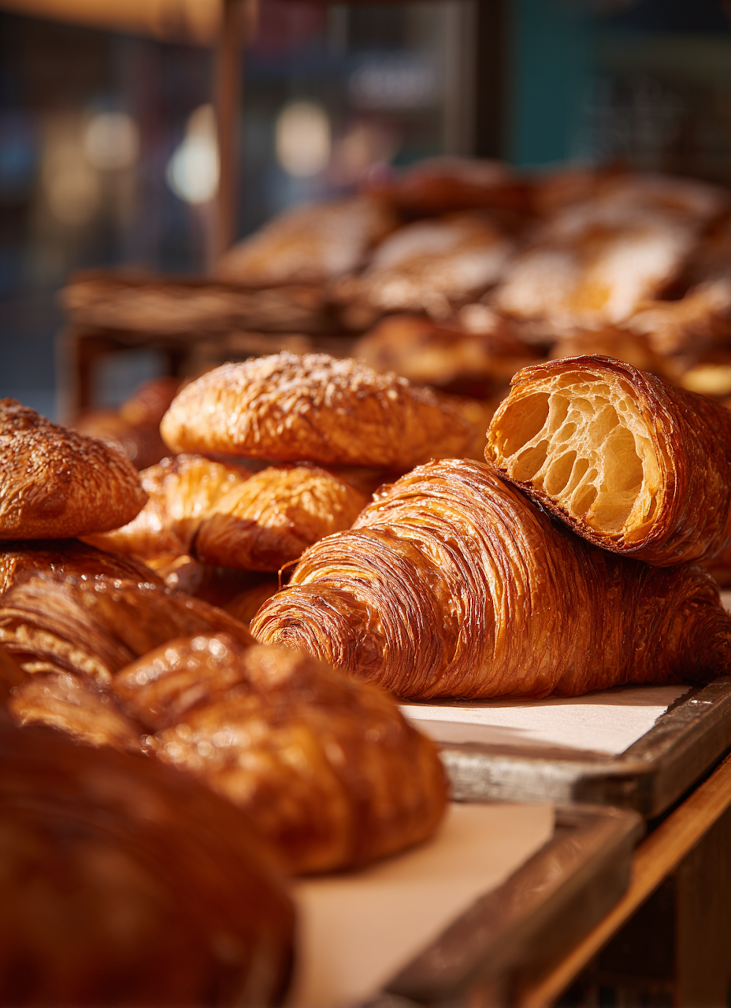 Freshly baked croissants with golden, flaky crusts and airy interiors, resting on trays in a bright, inviting bakery.