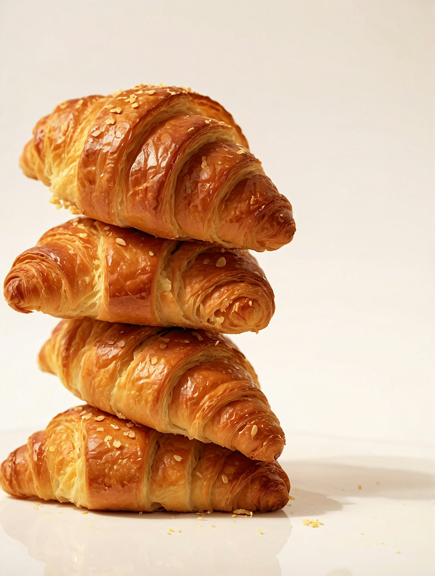 Stack of golden, flaky croissants with sesame seeds on a glossy white surface. Perfectly baked and irresistibly fresh!