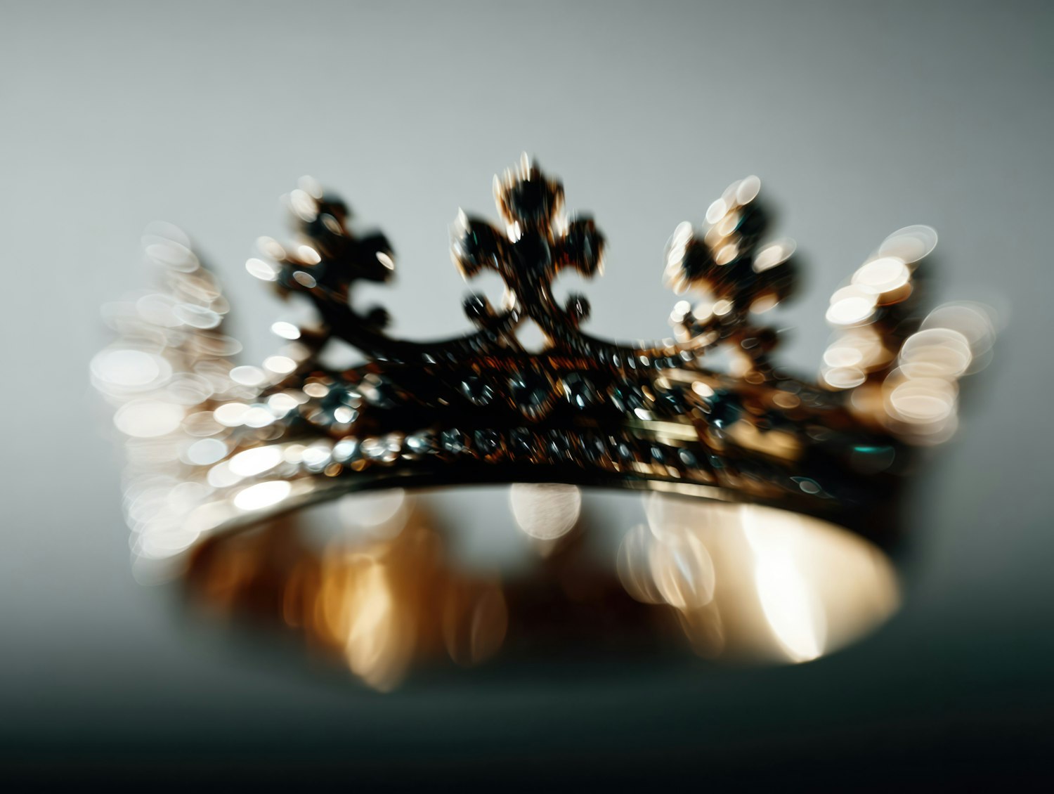 A golden crown with intricate designs and sparkling gems, captured in a dreamy, slightly blurred close-up with a neutral background.