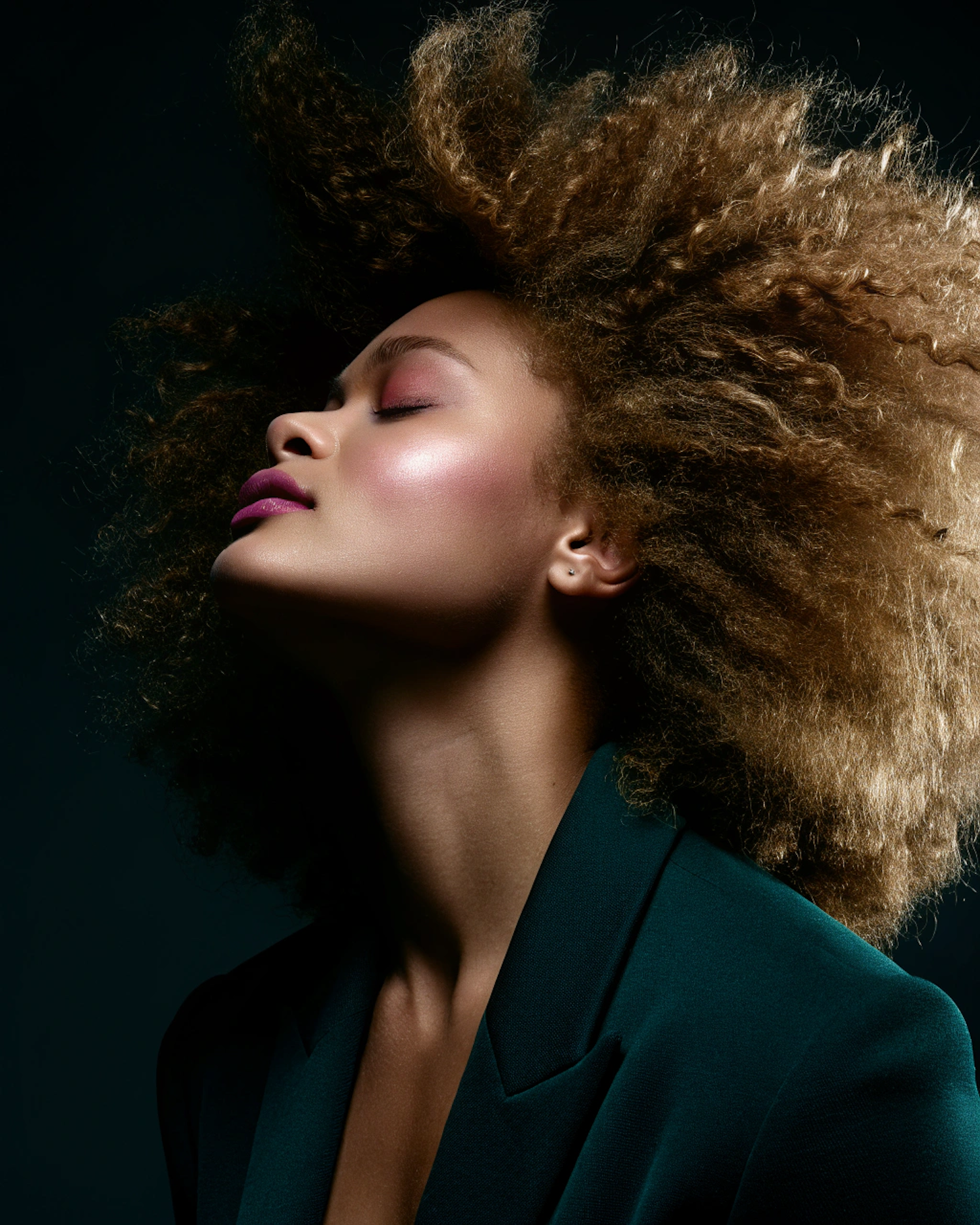 A stunning portrait of a woman with voluminous golden curls, bold magenta lipstick, and a dark green blazer against a dark background.