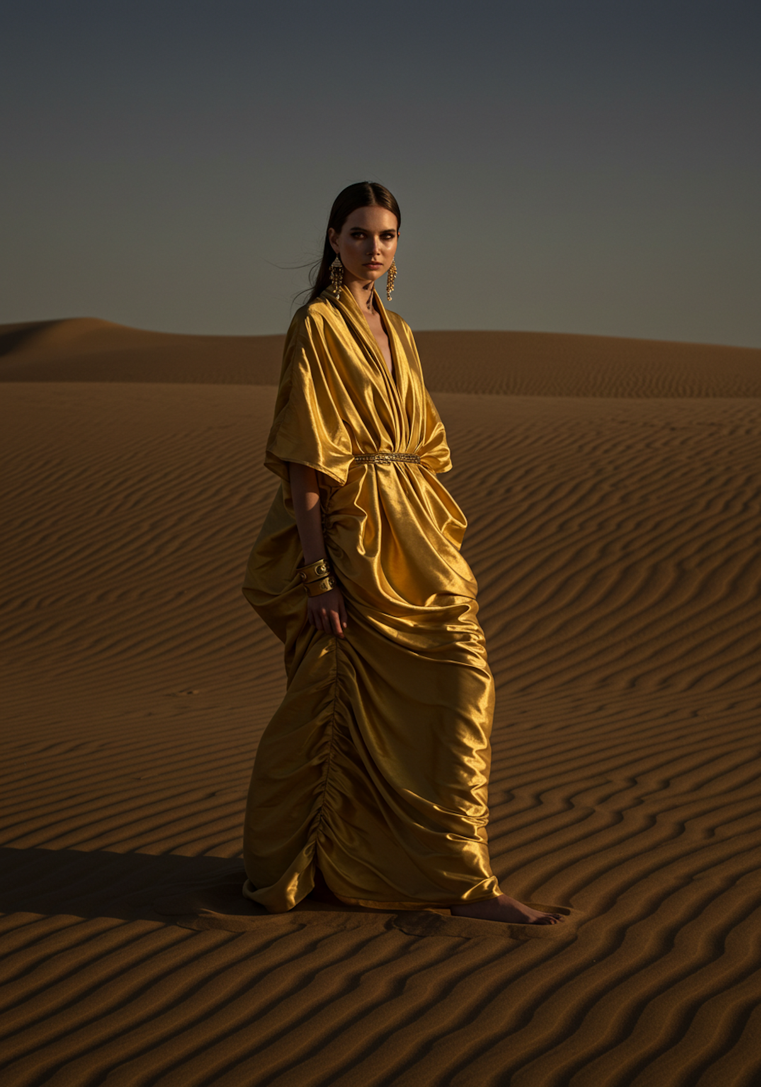 A woman in a flowing golden gown stands in a serene desert, accessorized with gold jewelry, blending elegance with the natural beauty of sand dunes.