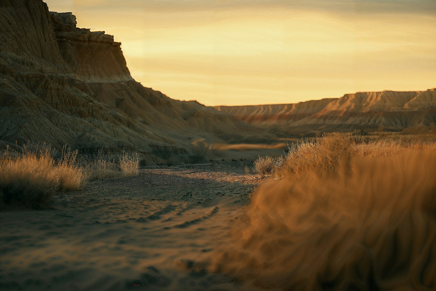 Golden desert landscape with rugged cliffs, sandy terrain, and dry grasses glowing in the warm sunset light.