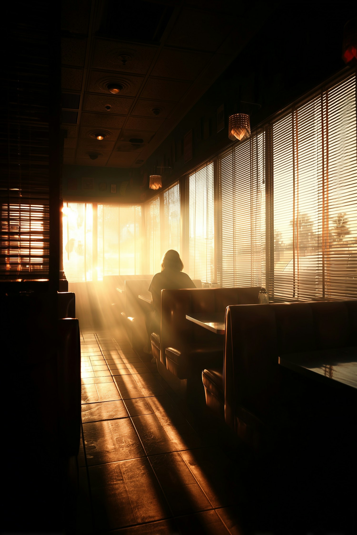 Golden sunlight filters through blinds in a quiet diner, casting warm rays on the floor as a lone figure sits in a booth, creating a serene vibe.