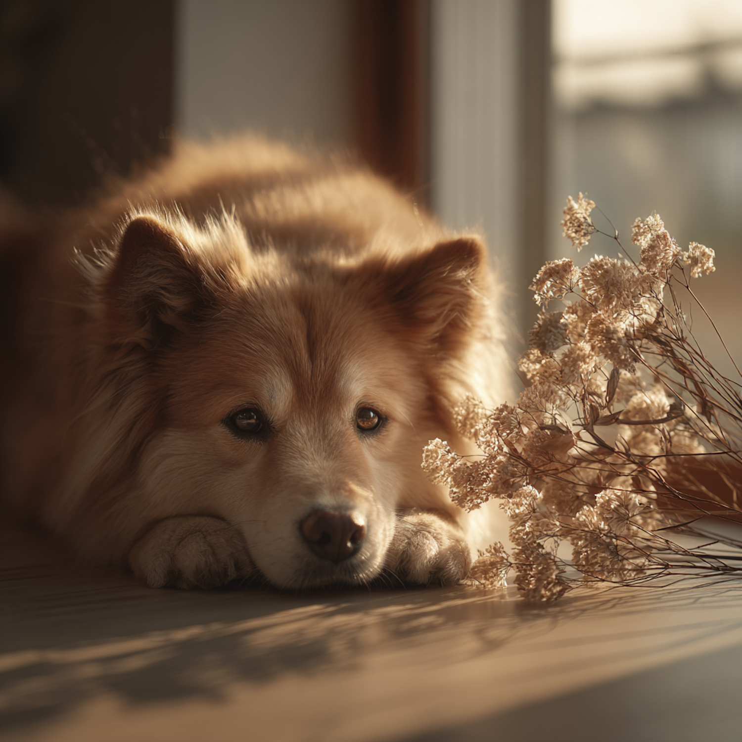 A golden-furred dog rests on a wooden floor beside dried flowers, bathed in warm sunlight from a nearby window.