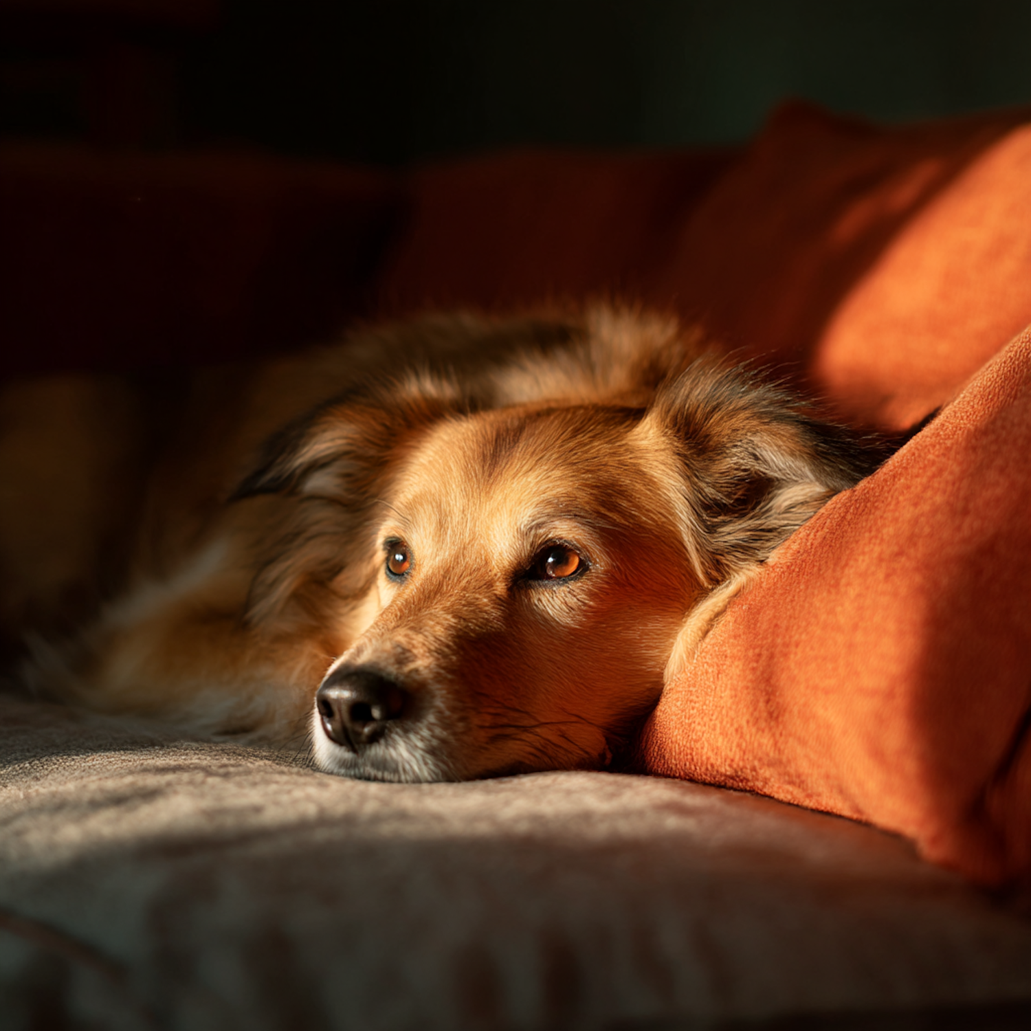 A golden-brown dog rests on an orange cushion, bathed in warm sunlight, creating a cozy and serene atmosphere.