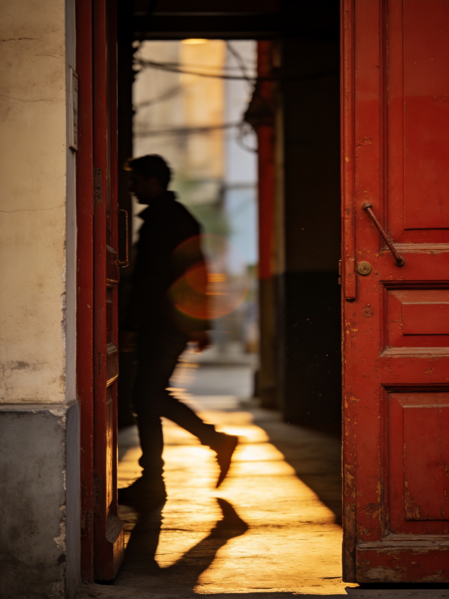 Cinematic street photography, warm daylight, natural documentary moment, muted surroundings with oxide-red doorframe as dominant accent, gentle film grain, subtle halation, shallow depth of field, 50mm lens look. A person stepping past an oxide-red doorway, sunlight spilling across the frame, soft shadows inside, calm city scene. No logos, no readable text, no brand names.