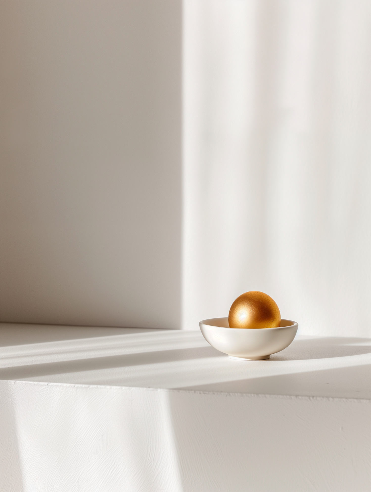 Minimalist scene with a white bowl and golden sphere on a white surface, casting soft shadows in natural light.