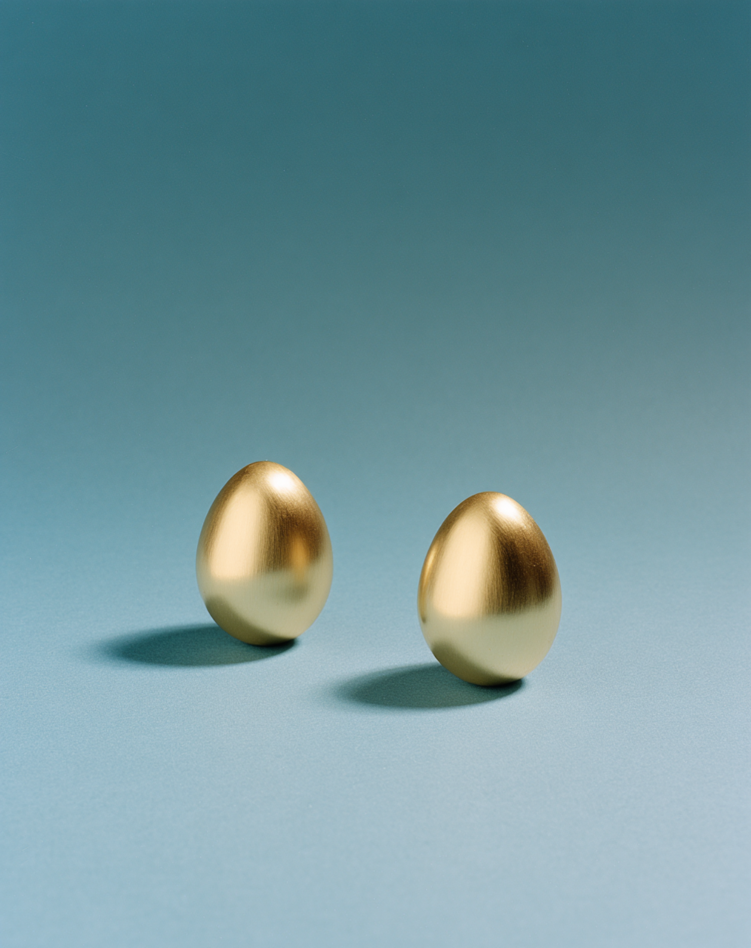 Two golden eggs on a smooth blue surface with a gradient background, creating a minimalist and elegant composition.