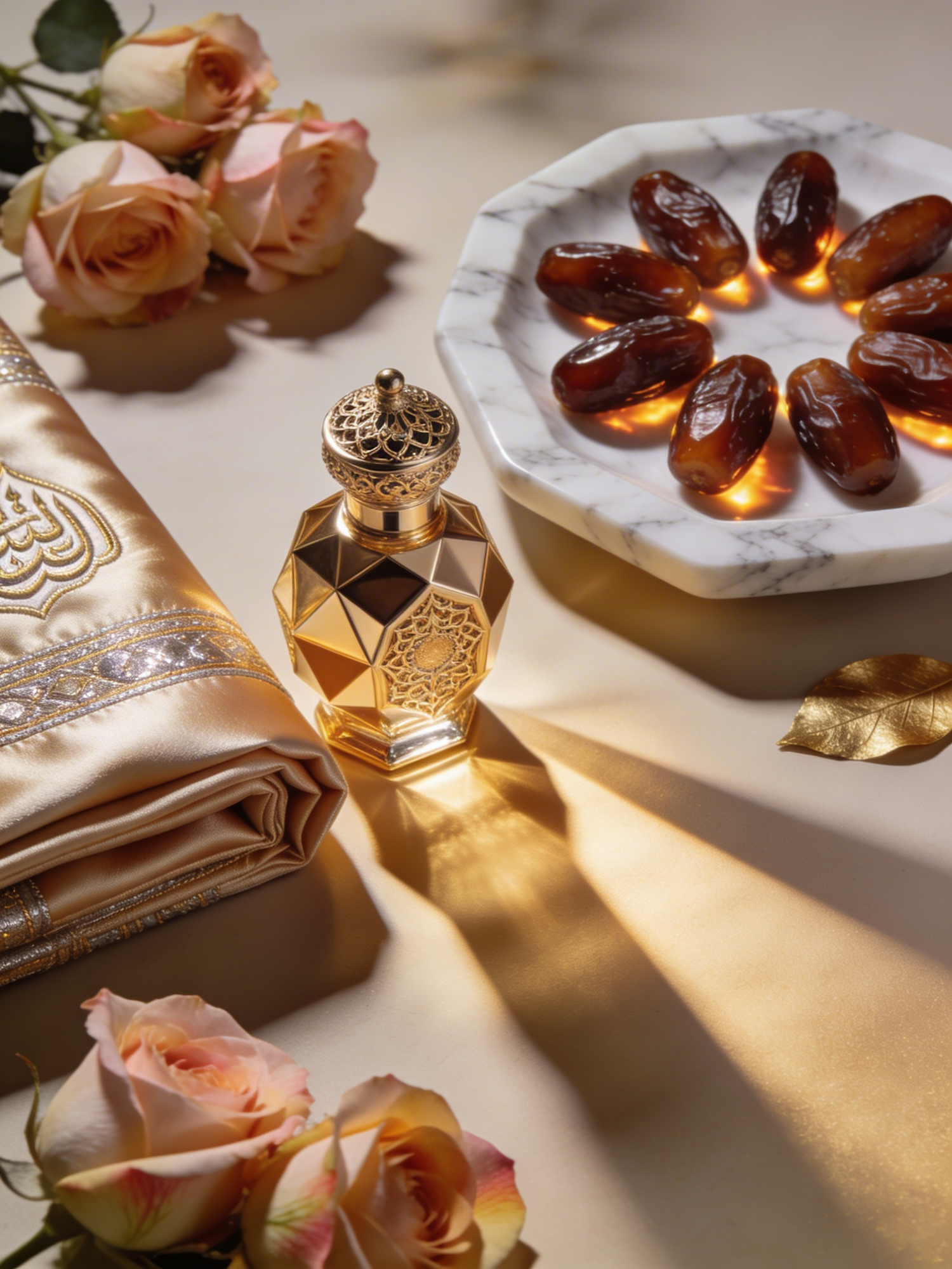 A high‑definition ultra‑luxury Ramadan still life. A sculptural gold perfume bottle sits beside a neatly folded champagne‑silk prayer mat. A white‑marble dish holds glossy dates arranged with precision. Soft blush roses add warmth. Warm spotlighting creates long, elegant shadows. No text, no logos.