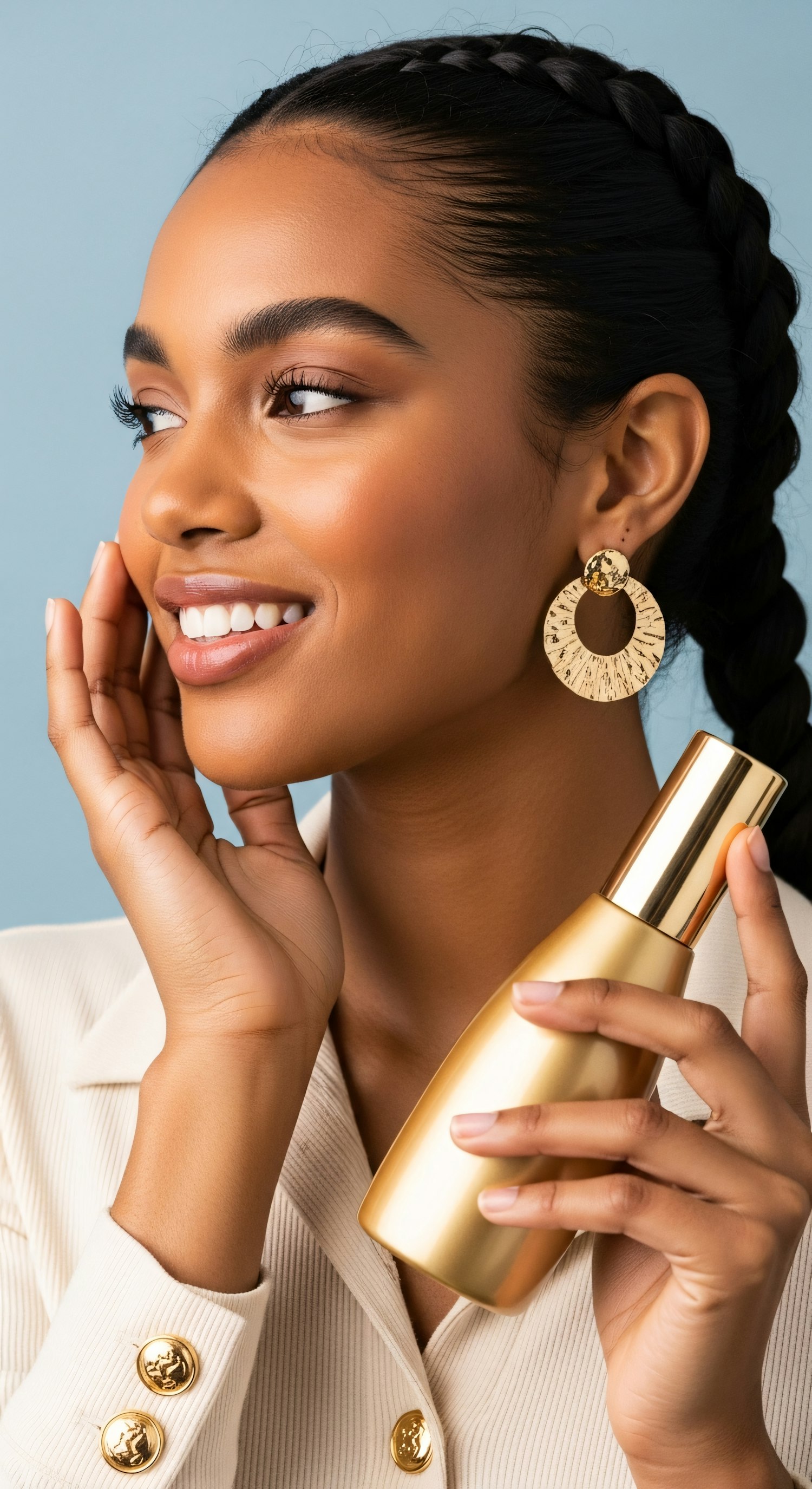Close-up of a stylish woman holding a gold skincare product bottle, wearing gold earrings and a cream outfit with gold buttons.