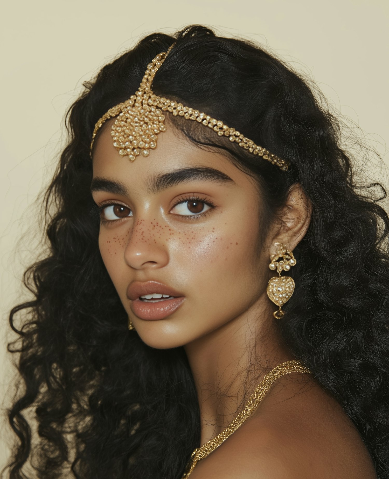 A woman with curly black hair and gold jewelry, including a headpiece and earrings, against a beige background.
