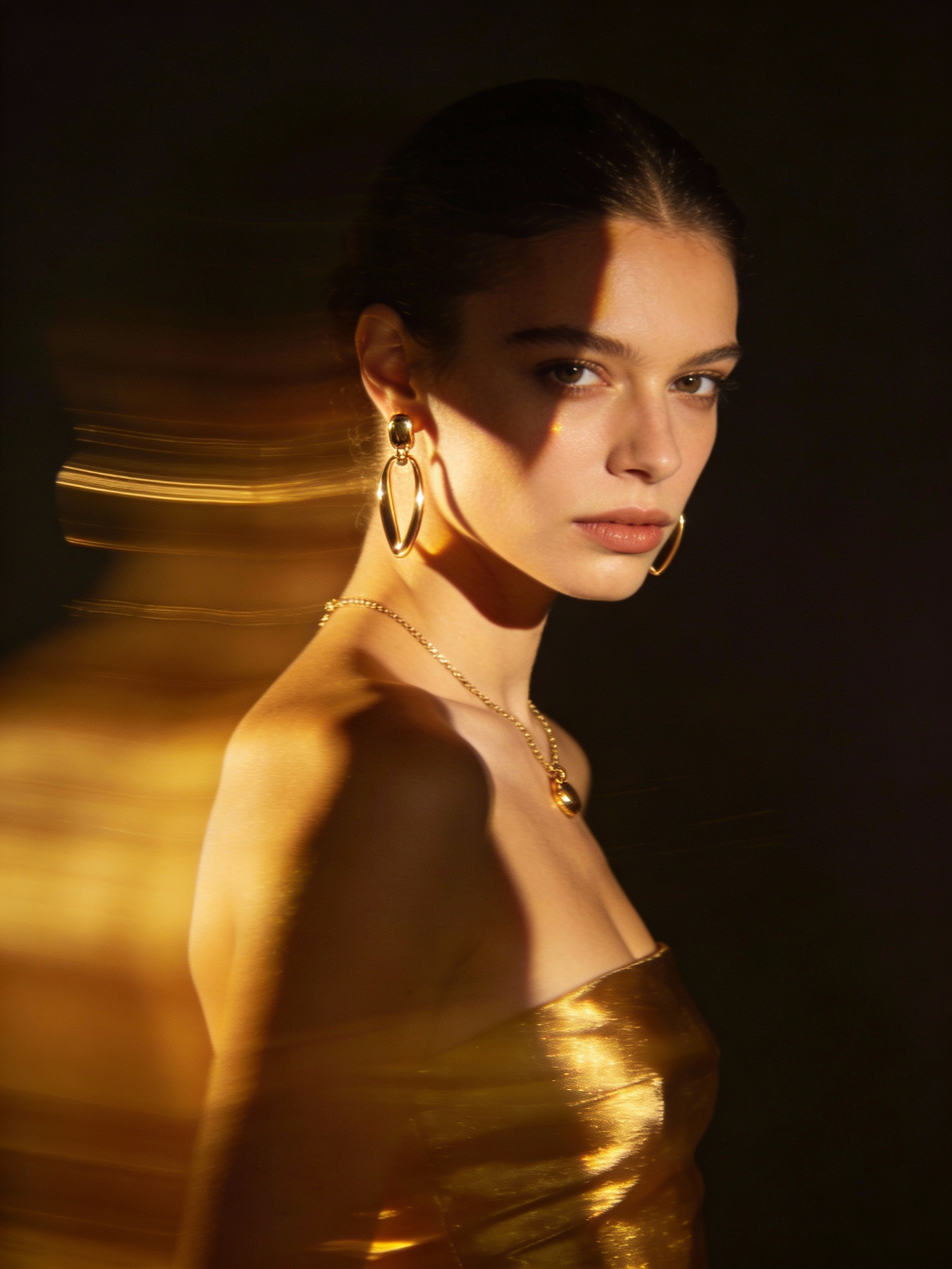 A high-fashion editorial photograph for a fashion magazine featuring a side profile of a model, looking directly into the camera, adorned with a few minimal modern pieces of luxurious gold jewelry. The image employs dramatic side lighting creating a warm, golden glow, with natural motion blur effects that add a dreamy quality. Captured against a dark, moody background. The aesthetic is elevated by artistic lighting techniques that create striking reflections and shadows