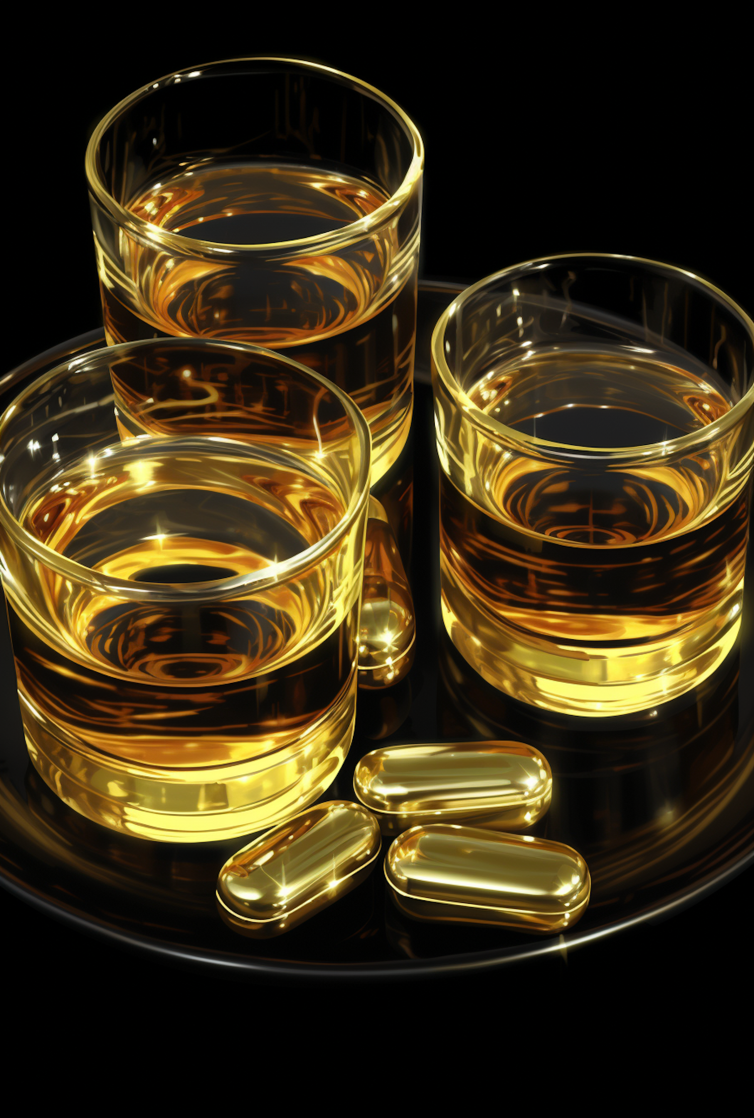 Luxurious scene with three glasses of golden liquid and shiny capsules on a reflective surface, exuding elegance and sophistication.