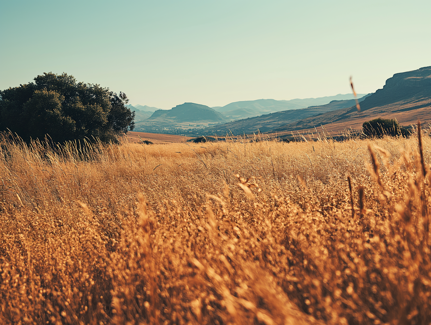 Golden fields under a clear blue sky with distant mountains and trees, creating a serene countryside landscape.
