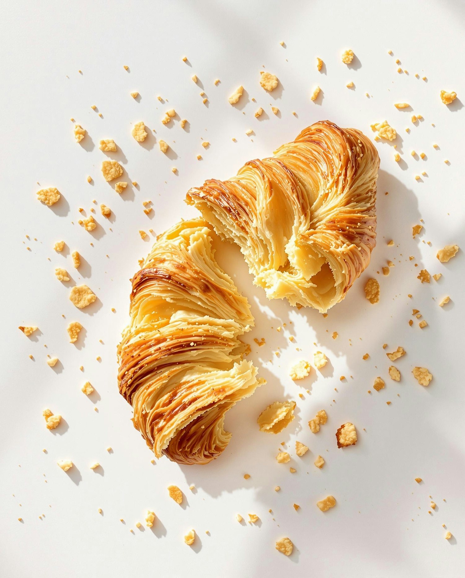 A flaky golden croissant, open to reveal its layers, lies on a bright surface surrounded by scattered pastry flakes.