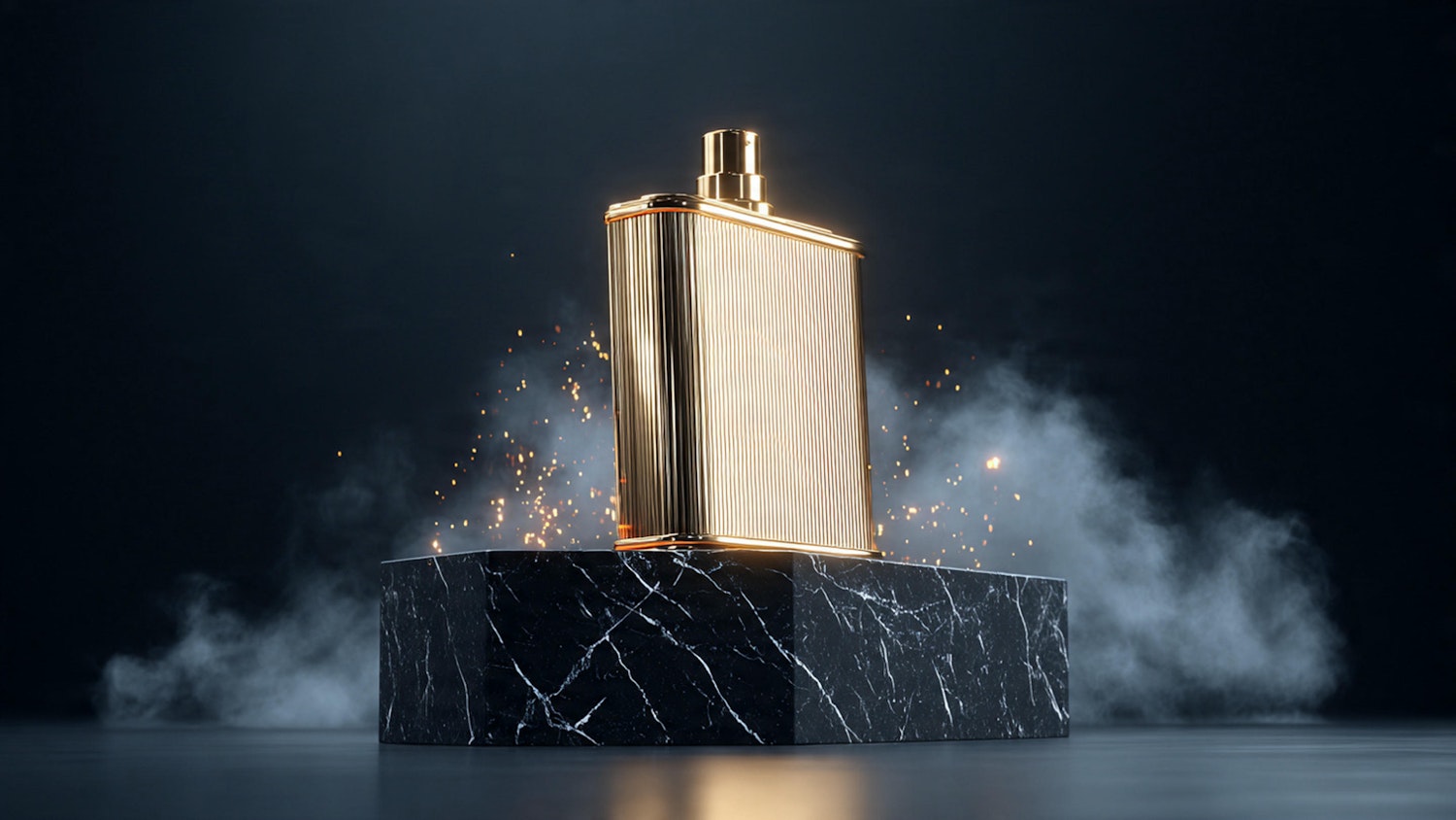 A golden flask on a black marble pedestal, surrounded by smoke and sparks, creating a luxurious and dramatic atmosphere.