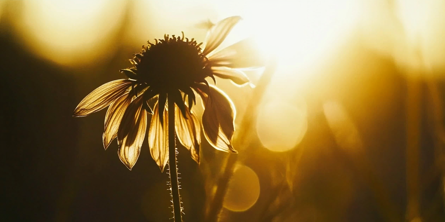Silhouetted flower against a golden sunset, with translucent petals and a serene, glowing background.