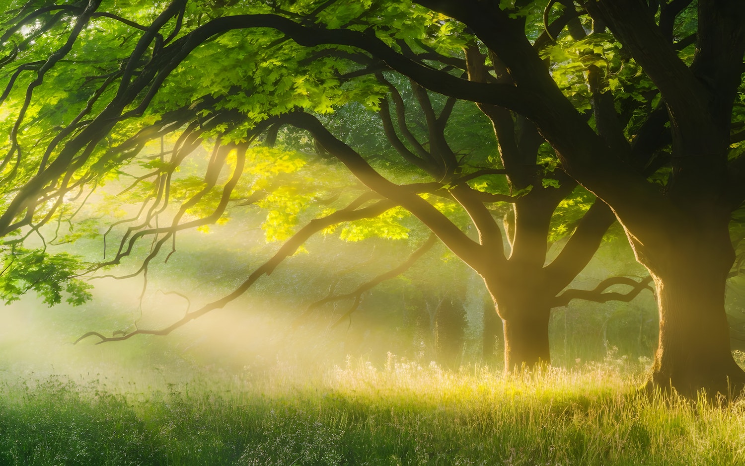 Sunlit forest with vibrant green leaves, gnarled tree trunks, and a misty, golden glow creating a tranquil, ethereal atmosphere.