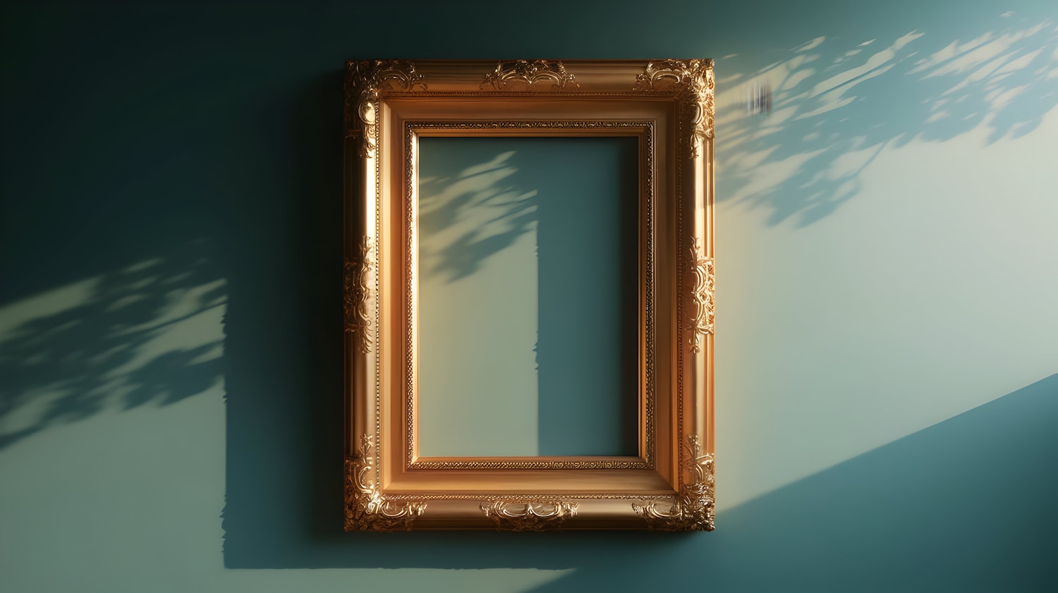 Golden ornate frame on a teal wall with sunlight casting intricate shadows, creating a minimalist yet elegant aesthetic.