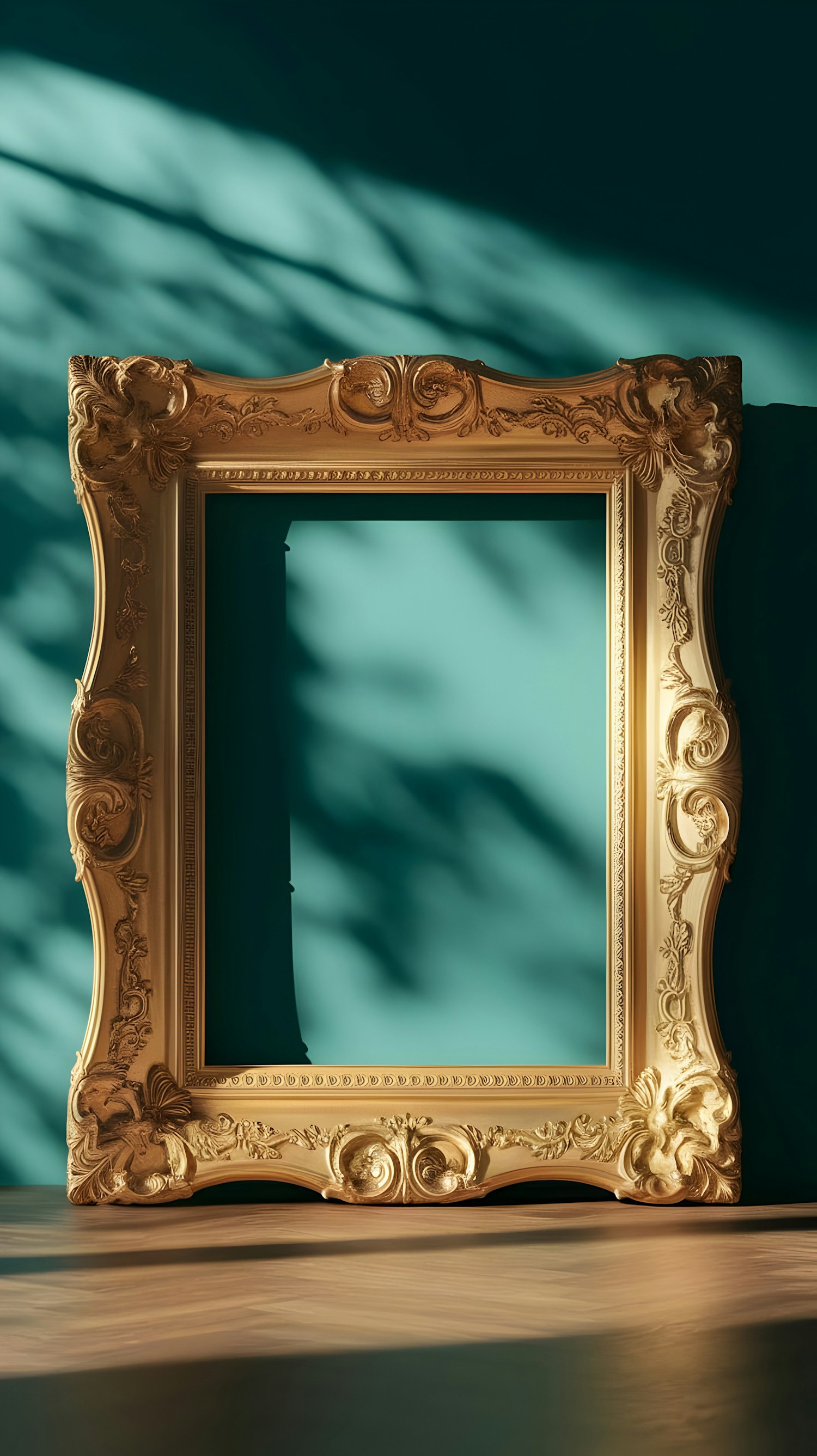 A luxurious golden picture frame with intricate details against a teal wall, bathed in soft sunlight and shadows for a vintage aesthetic.