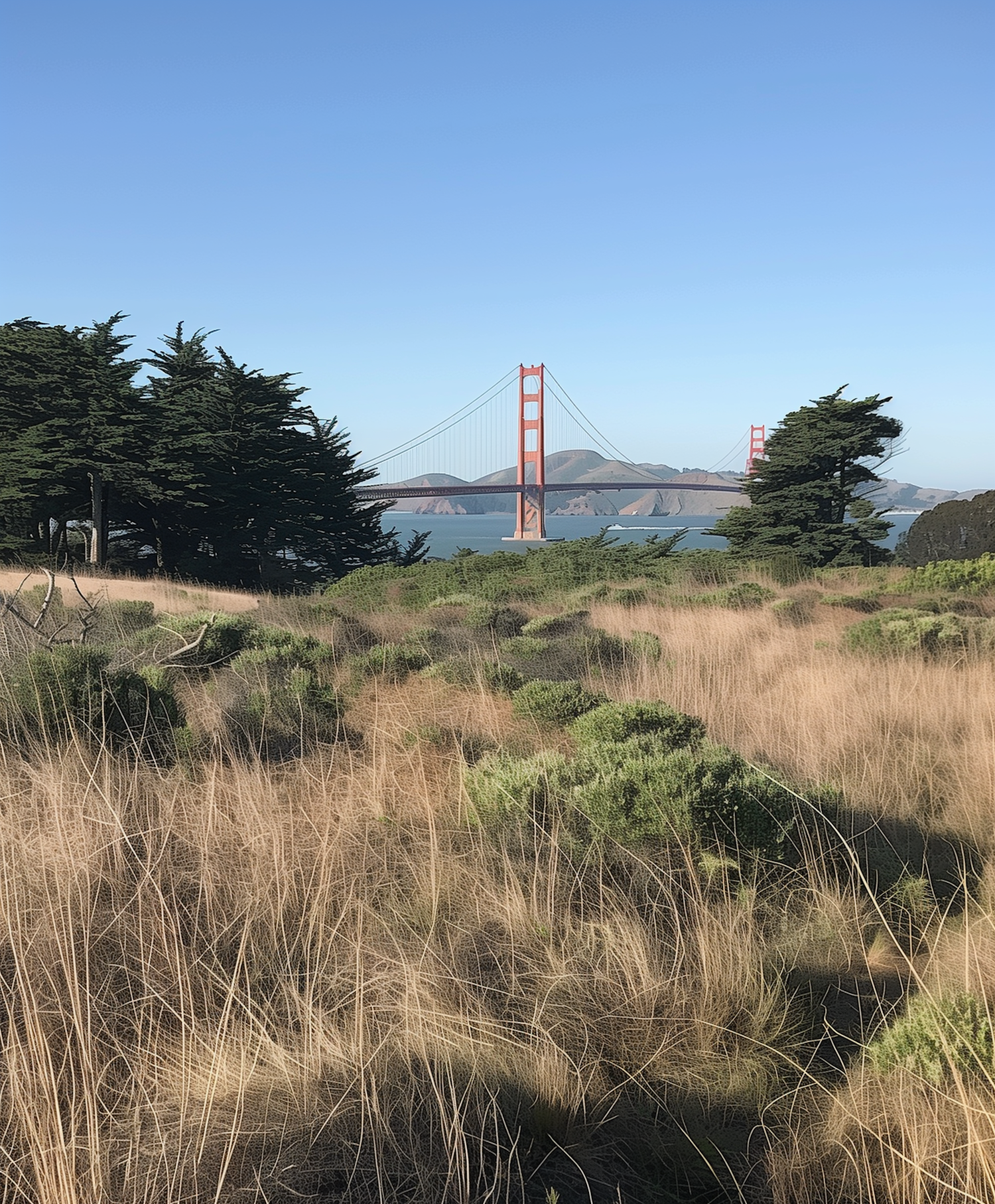Golden Gate Bridge framed by lush greenery and tall grasses under a clear blue sky, capturing a serene San Francisco landscape.