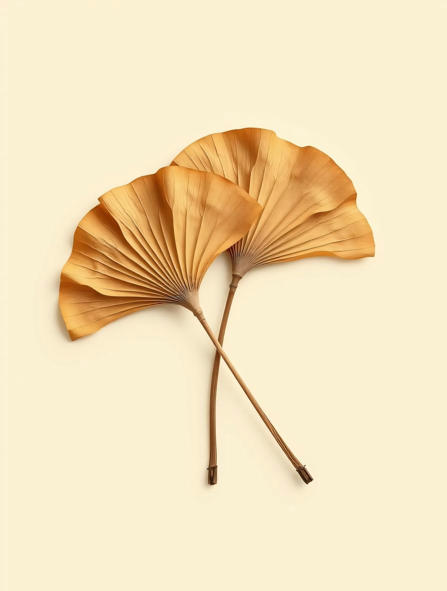 Two golden-brown dried ginkgo leaves on a beige background, showcasing their fan-like shape and delicate texture.