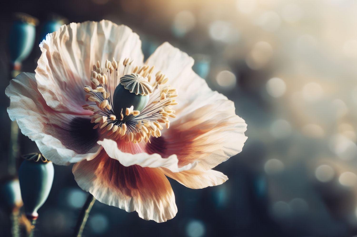 Close-up of a poppy flower with delicate petals and a prominent seed pod, set against a soft bokeh background.