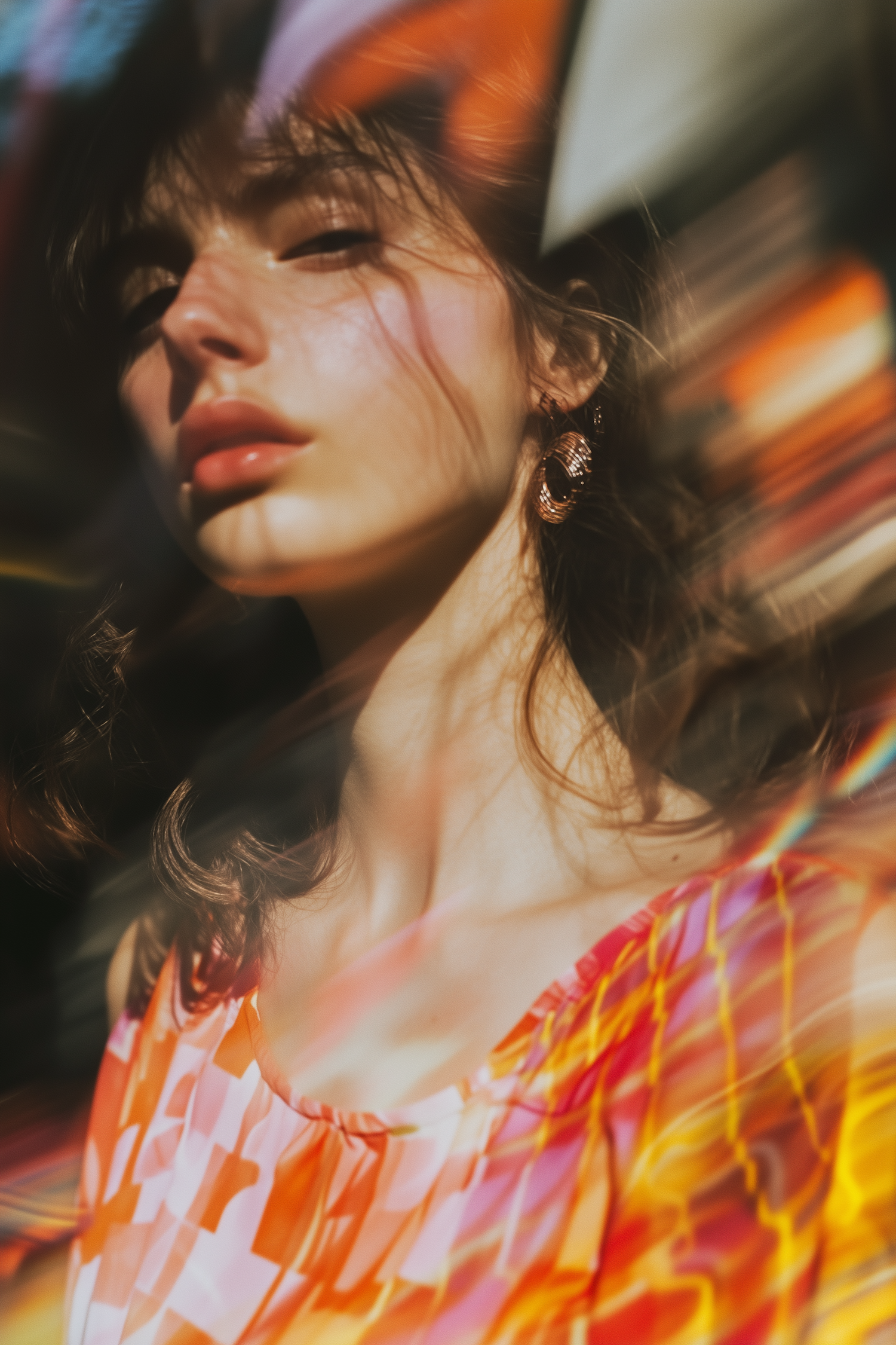 A young woman in a vibrant patterned top with golden light streaks and warm tones, creating an artistic and dreamy atmosphere.
