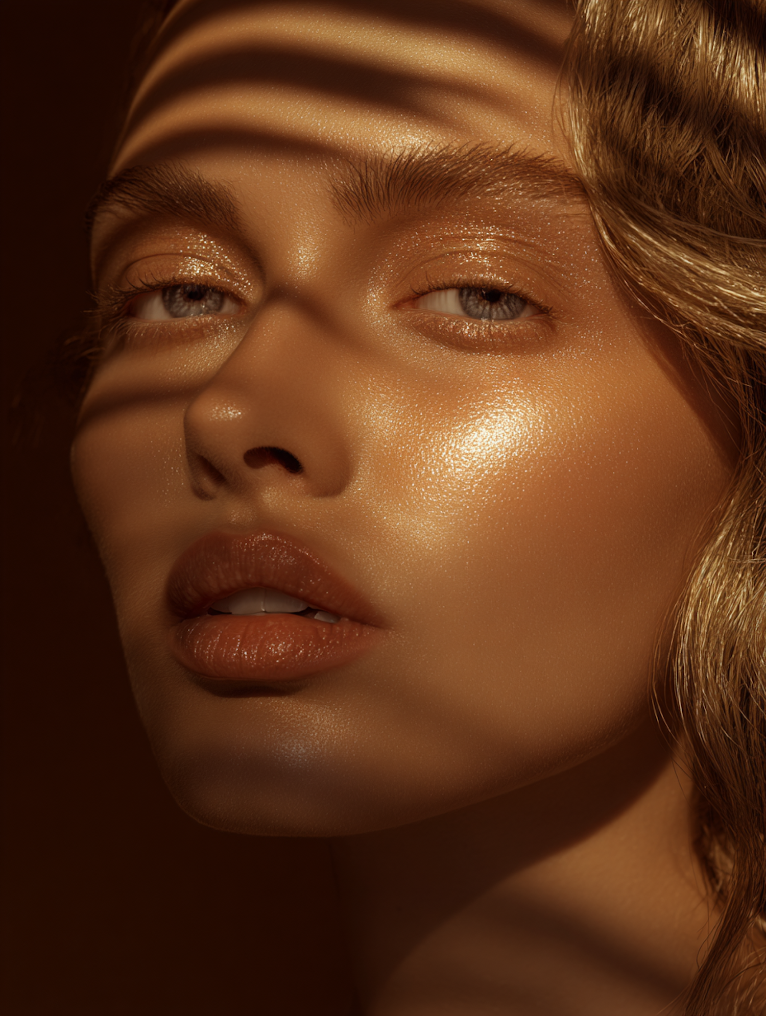 Close-up portrait of a person with glowing skin and artistic lighting, featuring warm tones and a textured shadow pattern.