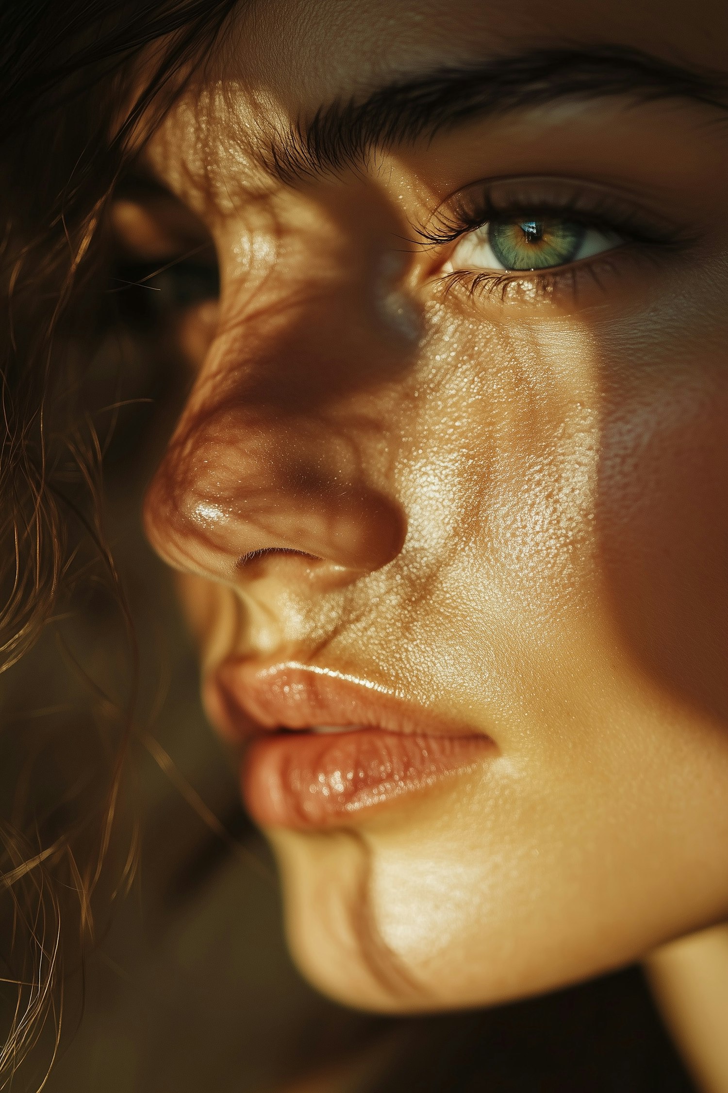 Close-up of a woman's glowing face in warm sunlight, highlighting her green eye, glossy lips, and intricate shadow play.